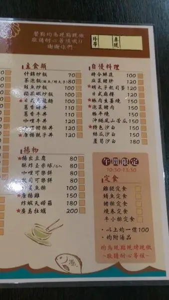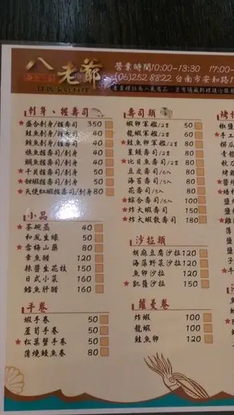 八老爺吃飽喝足日式家庭料理週日和朋友來個大台南地區各景點一日遊,玩一圈回來就在安南區吃飯。這間“八老爺”是當地朋友推薦的平價日式家庭料理,菜色種類也多~剛好點幾道菜,大家一起分享剛剛好^^ 『八老爺吃飽喝足日式家庭料理』招牌閃亮亮的寫著八老爺,又大又亮~夜晚去很是顯眼!不必擔心看不見~^^車子路邊停好,就直接走進去!櫃台&料理區都在外邊,內用座位區在裡邊。用餐時,我發現不少人都是來外帶,外邊一直有人在等待!其實~假日不一定要外出用餐,有時打包回家也是很不錯~櫃檯上擺放不少日本酒瓶~ 滿有日本風!聽說都是老闆喝掉的 XD 仔細算算,還真不少瓶...推開門入內,可愛的招財貓&摩艾復活神像在這迎賓!走進去有嚇到!我以為是到了電影海報收集 或 模型店之類的...吸引我目光都是那些個性十足的電影小看板 和一堆公仔模型! 我這個玩具控開心得很~(^0^)要不是四周的天花板處擺滿日本酒瓶,提醒我這是間居酒屋或是日本料理店,我還真的打算好好地參觀一下全部的劇報和模型XD店內冰箱櫃內有簡單飲品酒類,大家可以自取!結帳時店員會清點數量計價。瞧!一堆模型都是老闆從國外帶回來的收藏品喔~^^餐具也可以自己拿:新菜色,不在菜單上,都手寫在店後的看板。有需要也能問問店員~從店後方拍一張:等待餐點的時候,跑去樓上看看,樓梯那邊有寫二樓是包廂,有提供團體/小家庭預約使用:『八老爺吃飽喝足日式家庭料理』菜單:味噌湯只要30元,其他餐點從40元~400元不等,價格算滿平實的^^現在仔細研究,才發現也有午間限定的100元定食呢!餐點現點現做,我們等了一下子:魚肉味噌湯:漂亮有質感的和風瓷碗盛裝,還沒開蓋,就充滿期待!打開上蓋,果真是不枉我們的期盼!一碗30元的味噌湯,份量不算小。裏頭是滿滿好料,白色的豆腐丁~吃起來香嫩,裡面還有滿多的”鮭魚&旗魚肉“鮮嫩又大塊 ,味噌湯喝起來則是鹹甜適中的那種調味。海藻野菜沙拉:沙拉的份量偏多,多人分食剛剛好^^裡面有清脆生菜,新鮮蔬果(綠色花椰菜,香甜黃玉米,番茄,香橙...),各式海藻,非常豐富!海藻的口感脆韌,我個人很愛^^搭配的醬汁是和風果醋,整體鹹甜帶些果酸味,吃起來非常清爽!店家招待小菜: 涼爽小菜,呈現的是蔬果的原始滋味!馬鈴薯泥,濕潤綿密中吃得到馬鈴薯的塊狀口感,真材實料!我也喜歡~^^培根干貝: 干貝用培根捲起,上方鋪滿魚子醬炙燒,整體味道濃鮮!口感上~培根烤的香脆,內部干貝軟嫩。干貝算是滿大顆又鮮甜~雞腿西京燒:問了店家為何稱作西京燒?原來,日本的”西京燒“就是”味噌燒“。雞腿上方塗抹”味噌醬“,然後慢火醬烤的很入味!味道非常香甜,又帶有芝麻香,感覺很下飯呢!雞肉本身的肉質鮮嫩有汁,肉大塊卻不老柴。 而雞肉皮下屬於比較帶有油脂的那種,口感偏軟嫩~櫻花蝦炒飯:炒飯份量也不算少~ 讓我們驚豔的是,櫻花蝦給的大又多隻~ 每一口都能品嚐到櫻花蝦的鮮味!炒飯也炒的粒粒分明,卻不油膩!這盤我可以!^^ 一人吃光光OK!盛合刺身: 整份綜合刺身,三百初,卻非常豐盛!裡面有:鮭魚,鮪魚,旗魚,紅甘,生食級大干貝,甜蝦,甜玉米。哇沙米,芥末醬也是現磨的,天然的溫和辛嗆,跟化學的就是不同!生魚片,誠意十足!厚度都超過一公分,口感彈,滋味鮮。薄鹽鯖魚:日本的鯖魚,其實味道就像我們在台灣常吃的鹹魚,只是味道卻不死鹹!鯖魚的魚肉肉質算細嫩,而且魚刺不多,容易挑掉!我通常可以自己一人把整尾吃光光~吃得乾乾淨淨呢!^^(媽媽說吃魚的孩子才會聰明~對吧?! XD)揚出豆腐:雞蛋豆腐厚切,表面裹上厚厚滿滿的柴魚片後入鍋油炸~吃起來非常酥脆,濃郁柴魚香 搭配甜甜的醬汁,好喜歡~而且明明是油炸的,卻完全不油膩呢!沖繩風山苦瓜:提到山苦瓜,我聯想到的是炒鹹蛋。店家這道卻不是~沖繩風味的日式家常菜,大量使用豆腐+雞蛋,和山苦瓜拌炒,還有少許豬肉片,最後再放上大把柴魚點綴。沒想到這樣的料理方式,山苦瓜竟甘香不苦呢!(我喜歡~)搭配豆腐、豬五花肉片、柴魚片,意外清爽的家常菜~^^炸大蝦壽司:店家使用的是大尾的"天使紅蝦" ,店家說過"天使紅蝦" 的蝦肉比較甜,所以才下重本使用這大蝦!除了鮮甜的大蝦,還有蟹肉棒、清爽生菜、苜蓿芽、日式蛋捲、香鬆...搭配酸甜醋飯,也是非常清爽美味的壽司呢!(也是我的愛~)結論:一間平價的日式料理~個人最愛的前三名,是...料多味美有飽足感的魚肉味噌湯&吃起來格外酥脆濃郁柴魚香的揚出豆腐&紮實蝦甜的炸大蝦壽司。如果大家有來到安南區,可以偕同親朋好友來開心吃喝喔!…查看更多