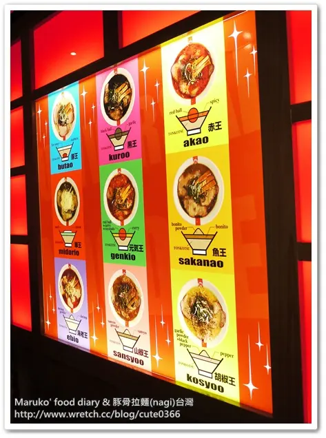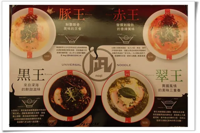 Nagi凪 豚骨拉麵算是一間讓我覺得很用心的拉麵店。店內除了四大天王外,每次拜訪都是為了他們的限定王...由於吃了不少次,所以通通把它整理在一篇。現在Nagi在台灣已拓展到三間分店了,有西門店、忠孝店、天母店。而西門店又是在台灣的第一間店,因為距離我家較近,理所當然就是西門店的忠實顧客囉~所以就先從店裡的裝潢擺設介紹囉!西門店的位置就在絕色影城6樓。 一進門是有朝氣的招呼聲和親切的帶位!接著就會直接看到煮麵吧檯。 吧檯上擺著一隻不倒翁,這不倒翁一邊有畫眼睛,另一邊卻沒有!?不知有什麼涵義?帶好位子,店員就會隨即遞上點菜單,以及介紹拉麵和當日的限定王。吃拉麵也是可以客製化的,看菜單就有好多選項可選。另一旁的照片是其他口味的海報。 在湯底部分可選味道濃度、香料、調味。叉燒肉又可分為豬肩肉 (一般常見的叉燒)、豬腩肉 (較肥的焢肉);蔬菜有最常見的蔥,另外還可以選擇高麗菜。麵條種類分為細麵跟太麵 (粗),軟硬度也可挑選。 辛酸菜一開始入口,味道其實不錯,只是到後面有些重鹹就是了。反倒是辛豆芽比較出乎我意料~辛豆芽跟酸菜的辛味差不多,只是豆芽多了甜味,所以吃起來就沒這麼重鹹,好吃。接著就先介紹Nagi基本款的四天王吧~首先是店裡的招牌的豚王 (200元)。 雖然這碗是芝芝小姐點的,但是都會借來吃一下哈...不過我終於知道為什麼大家這麼愛豚王!最重點還是它的湯頭,我喝過一次,最後會變成這樣... 直接完食 (碗底有字)!!只能說它的湯頭真是喝起來濃郁又不死鹹耶~大推啊!!(真的第一次拜訪Nagi,可以先從豚王吃起喔~)黑王 (230元),店員會貼心的建議先喝口湯頭,再攪拌來吃。 由黑芝麻和秘製黑醬製作而成,黑王的湯頭喝起來很鮮甜,還可以吃到墨魚的碎肉,豚骨湯頭雖濃,但卻帶有鮮的滋味,真的不錯。而蔥香而不嗆辣,加分。不過這每碗豚骨拉麵,都有不少叉燒的碎肉塊在湯裡頭,真的是料多實在啊~翠王 (230元)。 把青醬用入拉麵中,真的是很少見呢!上面還灑上滿滿的起司粉,吃起來很香濃,雖然我們味道濃度都選普通,但還是濃郁些。(不過整體吃起來,感覺還是沒這麼的搭,我跟芝芝小姐沒有太愛...只能說創意滿分囉~)而這碗是芝芝小姐點的,她叉燒選的是豬腩肉。其實這叉燒就是焢肉吧!味道很多汁入味,但也蠻濃郁的,女友很愛,但是我還是比較偏愛一般瘦的叉燒~叉燒 (豬肩肉)。 這叉燒我蠻喜歡的,既香又不會太肥,帶有些嚼勁。(但是很多人比較喜歡肥一點的。)另外來介紹一下麵條,麵條分為細麵跟太麵 (粗)。一開始Nagi都只有獨賣細麵,直到了2013.04.16太麵終於出現囉~ (4/15西門店開賣。)此為細麵,芝芝小姐吃拉麵比較偏愛細麵。 不過麵條細歸細,但蠻有口感的。(麵條軟硬度皆可依你/妳喜好所選)像我吃拉麵就一定要吃粗的,這樣才有吸拉麵的快感嘛哈... 不過太麵真是太棒了,非常的Q彈、帶勁,狠狠的吸下一口,彷彿人就在日本一樣~最後四天王的最後一王,赤王 (230元)。 由於很久沒吃辣了,所以也只選了1辛而已。店員也一樣很貼心的提醒我們先喝一口湯頭,再將上面那一球赤肉丸攪拌,風味更棒。不過這湯頭真的很棒耶!因為只有1辛,不至於太辣,帶有些甜甜的微辣感,真的超好喝,我愛慘了... (一開始心中第一名是黑王,顯然赤王把它壓過了。)而那赤肉球攪拌後,使得湯頭更加甜美,而且並不會太死鹹,好吃!只能說紅通通的赤王真的超猛~還有吃拉麵,難免要加些配料或小菜。在餐具和調味料旁,有個白碗裝的蒜頭,一旁還有搗蒜器給您使用,算吃拉麵也有能自己親自動手的體驗。 加上蒜末提味,更富有香氣呢。另外半熟蛋 (30元),也是我跟芝芝小姐很常點的小菜。 一整顆半熟蛋用筷子剖開來,裡頭的蛋黃有如噴泉一樣湧出來。而且味道很棒,除了蛋黃的香濃感,一點也不會過鹹!接著Nagi最有特色的,就是它每週都會推出限定王拉麵,限定王-胡椒王 (250元)。 看那一整球黑胡椒,感覺都讓人冒汗了,似乎很嗆!一開始看到感覺有點後悔,但是喝了湯頭之後,發現不會很嗆耶~反而多了胡椒的香氣,帶有些微微的嗆度,其實是很順口的,雖然跟黑王都一樣黑黑的,但卻是不一樣的風味。而高麗菜很脆,還不錯。其中一碗我很喜歡的限定王-韭菜王 (250元)。 大部份不喜歡韭菜就是覺得韭菜很臭,而看到一整碗滿滿的韭菜,也未必有人敢嘗試。不過韭菜的營養成分又很高!所以一定要來支持一下~而韭菜王真讓我刮目相看,這韭菜只能用『香』來形容,而且吃起來又很鮮甜,本週限定王真是點對了。韭菜王的湯底是用豚王的湯,所以香濃又不死鹹,加上韭菜的香氣,真的很好喝~還有加入了中華文化的限定王-麻婆豆腐王 (250元)。不過芝芝小姐很愛麻婆豆腐,所以搶不贏她,就給她點囉~ 湯頭是用赤王的湯作為湯底。雖說是以赤王作湯底,但喝起來赤王中那甜甜的微辣感已不太見。反倒是辛麻感的味道偏重。而豆腐真的很軟嫩,不過不是很多塊...我覺得跟印象中的麻婆豆腐似乎不太像哈~ (P.S.麻婆豆腐王的蔬菜只能選蔥喔!)麵條是特製的山椒麵!! 這山椒麵條味道帶有辛辛的微麻感,口感吃起來像是蕎麥麵。嚴格來說不是不好吃,應該說蕎麥麵跟拉麵不太搭吧~所以我跟芝芝小姐兩人不是很愛。整體來說...麻婆豆腐王表現不差,可以讓人接受,只是覺得少一些麻,多一點甜跟辣,會把麻婆豆腐味道更突出~還有超具特色的限定王-月見王 (250元)。 N