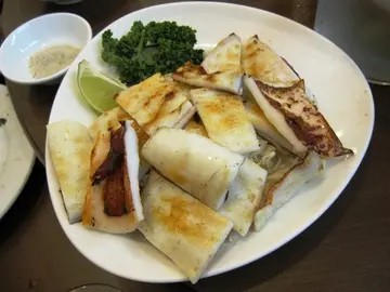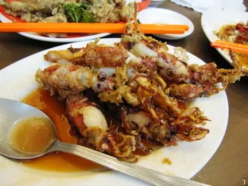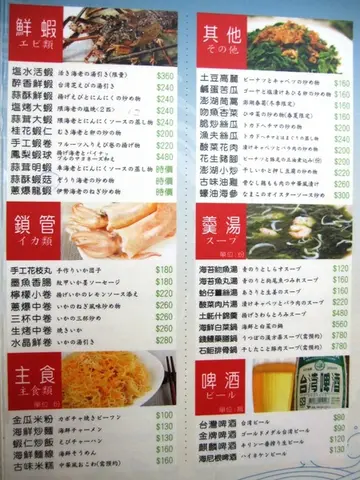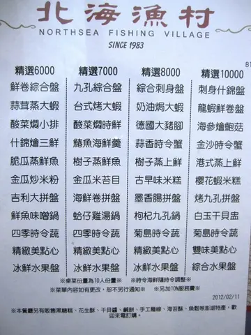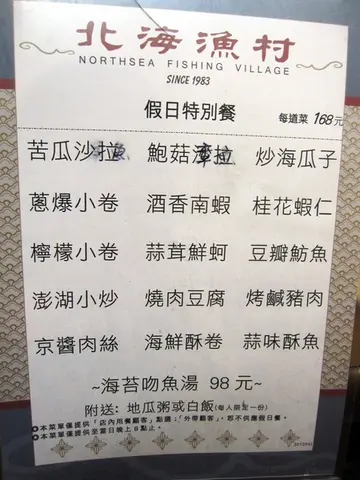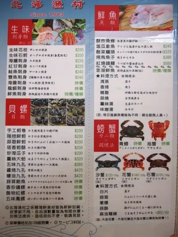 北海漁村有超過30年的歷史了主打澎湖直送的新鮮海鮮在老師的推薦下我們同學這次聚餐便選在這裡坐到善導寺捷運站走到杭州南路上就可以看到明顯的紅色招牌我們10個人訂一桌被安排在地下室用餐環境滿寬敞舒適的 鮮豔華麗的菜單封面 假日特別餐一般餐廳只有平日優惠菜色想不到這裡還推出假日特餐!一道168非常划算 生魚片魚蝦貝類老闆推薦這個季節的海膽不錯但我們沒人敢吃...生魚片一份大概7片其他菜一盤則大約三四人份鮮魚時價我們點了清蒸石斑大約一千出頭 蝦,花枝及其他類 也有套餐如果訂包廂是6000起跳懶得選菜的可以點這種配好的菜單但我們算一算覺得應該不會點超過6000還是單點比較划算 水晶鮮捲也就是清燙花枝啦冰鎮過的中卷口感特別緊實有一種新鮮漁獲才有的脆度和自然鮮甜不用沾醬就好吃或沾一點蒜頭醬油提味也不錯 金瓜米粉跟以前吃過的不太一樣顏色比較深而且口味比較重南瓜甜味比較淡可能加了比較多醬油調味但整體也算不錯吃起來滿濕潤的裏頭還有大蝦米 三杯中卷看著個漂亮的醬油色澤就知道師傅手藝不錯果然香氣重,中卷鮮新鮮的海鮮吃起來肉質特別健康味道單純就是一個鮮 醉香鮮蝦跟燒酒蝦比起來這道酒味不算重湯頭比較多蝦的清爽鮮甜蝦子也很新鮮,肉質緊實彈牙 脆炒絲瓜澎湖名產絲瓜是一定要吃的果然也沒讓我們失望跟一般比較軟爛的絲瓜比起來這個絲瓜比較脆而飽滿肉多勾芡的醬汁裹覆其上整個香滑可口,甜而多汁 蒜蓉鮮蚵這也是我們後來有加點的一道大拇指那麼大的鮮蚵裹上薄薄的粉後川燙淋上特調蒜蓉醬油配上底下的豆芽跟香菜一起吃鮮蚵的滑嫩和豆芽的爽脆絕搭 炒海瓜子還不錯,但沒有那麼令人驚豔外面好吃的炒海瓜子滿多的 澎湖小炒特別的菜色點來試試跟客家小炒有點像只是更著重魷魚的海味下飯的一道 漁夫絲瓜另一道絲瓜料理但口味就清淡許多像是絲瓜湯一樣清煮少了火侯,絲瓜吃起來就比較軟爛一點 海苔吻魚湯綠色的海苔跟平常吃到的海菜不一樣吃起來更滑嫩柔細一些有點像是莧菜湯的感覺淡淡的海味還不錯 土豆高麗這道也是特色菜之一用磨碎的花生當作醬料炒高麗菜火侯到位,吃起來香氣四溢乍吃之下跟一般高麗沒兩樣但入喉後就傳來一股花生的土香味想不到搭在一起有一種很妙的滋味越吃會越想吃! 清蒸石斑這個鮮魚真不是蓋的普通好吃的石斑就是肉質鮮嫩細緻這個澎湖直送的鮮石斑魚肉質卻特別的緊實有彈性就像有運動的土雞一樣的道理但卻不因此肉質變老變柴一樣維持細嫩,只是吃起來更Q更彈獲得大家一致的好評! 海鮮酥捲裏頭是魚漿跟高麗菜味道鮮甜 蒜味酥魚比起剛那個石斑就遜色多了但因為他是特價168的菜味道是還可以啦就是油炸後淋上蒜蓉醬油 生烤中卷這個好!我發現我們很愛點中卷類跟鮮蚵類因為新鮮吃得出來~烘烤過的中卷海味更香跟三杯料理味道不一樣而且他切成這樣大小,更吃得出肉質的緊實彈性沾上胡椒鹽,撒上檸檬~讚! 塔香蚵酥本想開玩笑的點個鹽酥雞三寶之龍珠但這裡沒有所以點了類似口味的塔香蚵酥果然好吃!第一因為蚵仔夠大隻夠新鮮即使油炸後還是保持完整顆粒咬下去還是多汁第二是加上九層塔的香味就讓人越吃越涮嘴! 檸檬小卷這一道我沒有吃到不過據同學表示小卷炸的很酥脆連鬚鬚都很酥脆也很受歡迎 點來下酒的烤鹹豬肉這個就不用特別點了跟一般的沒兩樣 這次北海漁村我們10個人吃了大概5200元點了大概20幾道菜大家都吃得很滿意我覺得人多的話來這邊單點CP值很高推薦鮮魚和鮮蚵,中卷類當然隨著季節變化漁獲不同也可以請老闆娘介紹推薦~…查看更多