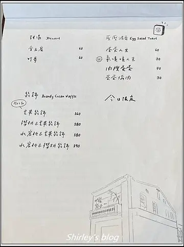 隱身赤峰街老宅二樓的特色店先前路過二次都客滿已一段時間了,再來碰碰運氣老房子樓梯較為狹窄往上走陽台滿是綠意自然風格 入內詢問太好了,還有空位店員請我自找座位我選了角落的位子menu也是如此古樸友善小叮嚀品項簡單就二張目錄 餐具也是此店特色看了一下,價格也很平實 愛玉蜜60元芒果鬆餅180元新鮮芒果+一球鮮奶油 樓下的卜卜商店喜歡餐具的人在此可以找到不少寶