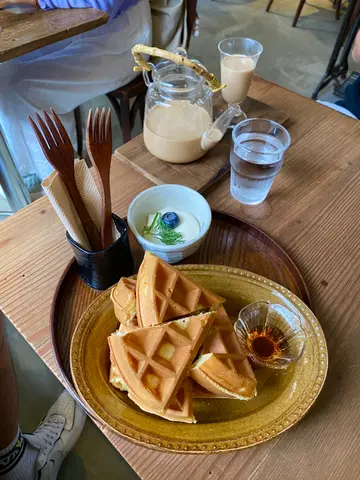 這家由老宅演變成文清咖啡店,店主用心思地佈置整間咖啡店,植物從由樓下門口開始,到樓上室外範圍,也很別緻我很喜歡這樣用植物改做老宅,並仍保留原有的老宅氣氛午餐今天點了:- 塔香三杯雞肉飯:很香九層塔,配上嫩雞髀肉- 蘋果咖哩牛肉飯:微辣的咖哩,帶有蘋果的甜味- 加購餐後甜點:- 草莓抹茶蛋糕:抹茶戚風蛋糕好鬆軟,忌廉好香滑,配上新鮮的草莓,100分- 焦糖鮮奶油鬆餅:熱辣辣的油鬆餅食物質素好好,甜品不會過分甜,剛剛好,飲品都唔錯,值得推介給大家