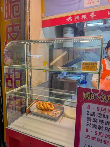脆皮鮮奶甜甜圈 是一間吃台式甜甜圈的老字號名店。因為住的旅館就在附近,所以每次路過都會見到有人在排隊。剛好搭的士在太原路口下車時,司機說這間店很出名叫我們試試看。抱著嘗試的心態買了一個,大約排了10分鐘左右。很多人一買就大量,就見一直在製作,於是拿到手時仍燙手呢。🍩脆皮鮮奶甜甜圈 (TWD 25)口感外脆內軟的甜甜圈,表面灑上了糖粉。比平時吃開的更有奶香味,而且質感更Q韌。我去的這間分店見到公告說10月1會移動到忠孝東路那邊。
