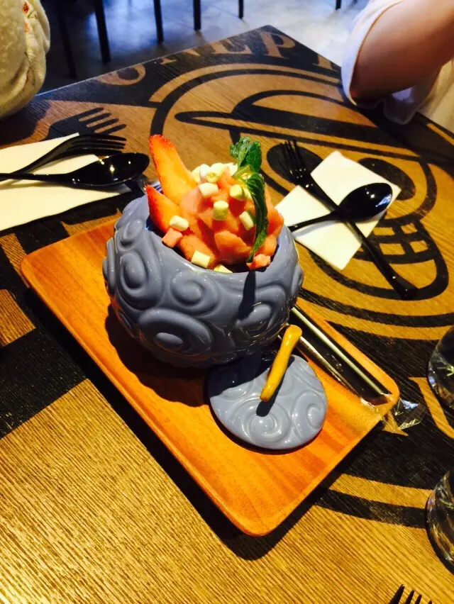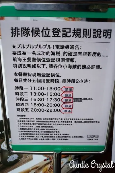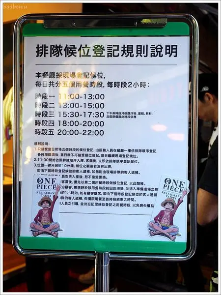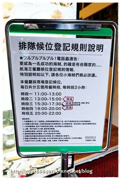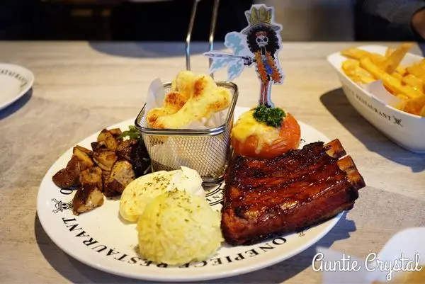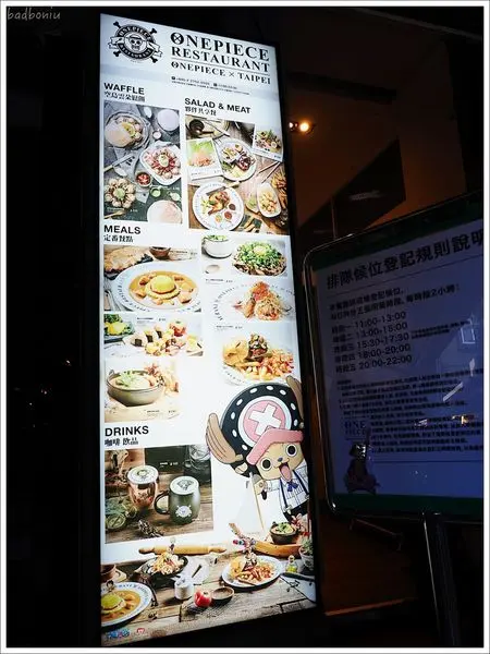盼了好久好久好久好久~~ONE PIECE終於航向台灣了!!!!去年和蔡老爺去東京時還特別帶著搞不清楚狀況的小球到東京鐵塔裡的海賊王樂園玩了一圈(小傢伙因此認識了草帽海賊團的全部角色XD)更在夜黑風高餐廳都快打烊的時候跑到台場的♥香吉士 芭拉蒂餐廳BARATIE♡用餐回來之後蔡老爺就一直碎念說為何台灣都沒有人想說要去引進海賊王餐廳呢?沒想到今年海外的一號店就決定落腳於台北~對海賊迷們來說實在太值得慶祝啦! 其實知道台北要開♥台灣航海王餐廳 ONE PIECE Restaurant♡時小菲就已經和蔡老爺說好要等人潮沒那麼洶湧XD之後再找時間來插旗沒想到居然超幸運托好姊妹Daphne的福~可以在開幕沒幾天就先來朝聖小菲可是興奮的不得了阿~很難得的放咱家阿球在一旁自拍個不停!哈哈♥台灣航海王餐廳 ONE PIECE Restaurant♡位於熱鬧的東區巷弄中最近的捷運站為忠孝敦化捷運站~從2號出口步行過來約5分鐘兩層樓的建築霸氣十足~經過時要不多看兩眼都很困難但其實餐廳只有位於二樓~上方還有草帽海賊團成員的剪影 另一邊則掛上主要角色們的特色旗幟 派出最討喜的喬巴來帶路就對啦!♥台灣航海王餐廳 ONE PIECE Restaurant♡目前全部都採現場候位預約制一天共有五個用餐時段~我們這天是下午一點的場次~十二點半過來時已經只剩下下午和晚上的位置所以建議大家可以一早先來登記~中間的空閒時間就可以在附近逛逛囉! 餐廳位於二樓~通道上有草帽海賊團的成員們在這裡歡迎大家的到來沿著樓梯拾階而上~彷彿就像真的走進千陽號一般一張張的海賊懸賞單是海賊王漫畫中很重要的一環懸賞金額隨著劇情一路上升也代表著主角們的成長走進餐廳映入眼簾的就是讓海賊迷們立刻陷入瘋狂的場景啦!!!九位主角們真人大小的公仔和迷你版的千陽號聽說因為是官方認證的海外一號店~所以就連九位主角的造型也全部都是專門為了台灣店而設計的唷!!!覺得超級熱血阿!!好想每個都跟他們自拍一下超可愛的喬巴~~咱家小球唯一最熟悉的好朋友XD因為之前帶他去看海賊王展覽時小球就一直餵他吃棉花糖~哈哈哈布魯克你為什麼要在後面這麼搶戲!!肯定會成為海賊王的魯夫~~希望最後不要跟Big Mon打起來覺得會被修理得很慘阿~~哭哭!嗯~娜美怎麼穿上女僕裝了 騙人布和羅賓每次想到騙人布把砂糖嚇暈那一段都覺得超好笑阿!!!這次在寫文時邊跟蔡老爺聊漫畫內容才知道蔡老爺現在最愛的角色是索隆問他說你之前不是喜歡艾斯嗎??結果這個人居然跟我說因為艾斯死了只好換人了(你這無情的觀眾XDD)好啦不過小菲真的也很愛索隆~每次都被他無可救藥的路癡+方向感笑到不行!♥香吉士 芭拉蒂餐廳BARATIE♡裡面的香吉士造型超帥氣~結果來到台灣變成愛心眼也太搞笑然後佛朗基和布魯克一樣都躲在後面~大概是因為他們兩人的身高太高沒辦法做成公仔的關係吧!哈哈哈 放上主角們的高度一覽表給你們參考一下(笑XD)雖說是迷你版的千陽號~但那質感真的不是蓋的阿!!!果然有經過官方授權認證就是不一樣讓人有回到日本朝聖海賊王的氛圍千陽號的兩側就是官方授權的正版周邊紀念商品啦!!切記不要逛太仔細~一個不小心就會像小寶哥一樣提個好幾袋回家!哈哈哈泥看看泥看看~有官方認證就是不一樣左邊這是魯夫的配音員田中真弓老師送給台灣店的簽名板阿!!台場海賊王餐廳裡也有唷!呼~~~寫了一大堆落落長的廢話XD終於要來介紹餐點啦!!!!♥台灣航海王餐廳 ONE PIECE Restaurant♡的MENU封面就是一張航海地圖呢! 由日本官方認證的餐廳當然餐點可不能馬虎這裡的食材都是經過特別挑選的像是台南11號白米、新社牛蕃茄、白河柳丁、安心檸檬等就是希望能兼顧健康與美味 餐點主要分為夥伴共享餐、定番餐點、雲朵鬆餅、夥伴蛋糕、惡魔果實冰沙、飲品等幾個大項價位都在NT200~500之間 很喜歡他們家的MENU設計~每頁都有主角們出現之外照片也拍得太誘人在點餐時真的會讓人很猶豫阿!!在這邊要提醒大家一下~若是你只是想來吃鬆餅的話一定要預約15:30~17:30下午茶時段這個時段只提供炸物炸物、蛋糕、飲料及鬆餅喔!布魯克烤肋排餐NT490最近深受毛皮族喜愛的布魯克當然主題就是骨頭啦(笑XD)牛番茄上還有華麗且架勢十足的布魯克除了主角烤肋排之外~一旁還有炒香菇.水波蛋.薑黃飯.還有骨頭造型的香酥吐司水波蛋上搭配了酸甜的荷蘭醬建議大家可以拌在薑黃飯裡一起享用會更加滑口豬肋排的部分口味很不錯~肉質蠻軟嫩的~吃起來甜鹹交錯帶點蜜汁的感覺如果可以再多個幾隻會覺得CP值更高XD骨頭造型的香酥吐司則是帶點奶油蒜香~~咱家小球愛吃得不得了~毫不客氣地連啃兩片!草帽小子咖哩藍帶豬排飯NT360說到魯夫的餐點~~有一年小菲去六本木時剛好遇到海賊王展覽當時餐廳推出的魯夫餐點就是代表性的一整隻肉骨頭小菲吃的可過癮的咧XDDD不過大部分看到的還是以草帽來做造型~特選台南11號白米加入養身的薑黃~紅色緞帶的部分則用番茄醬來代表底下的咖哩醬汁是溫和的微甜口味配紅蘿蔔切塊~點給小朋友吃也很適合喔!! 一旁搭配的是藍帶豬排佐和風醬汁外酥內嫩的藍帶豬排中還有鹹香濃郁的起司及火腿小菲還蠻愛這豬排的口感~~搭配咖哩一起入口很美味呢!對抗悲觀鬼魂活力餐NT320這道一上桌大家都忍不住爆笑~~那舌頭一定要這麼長就對了!哈哈哈而且為何我覺得他其實長