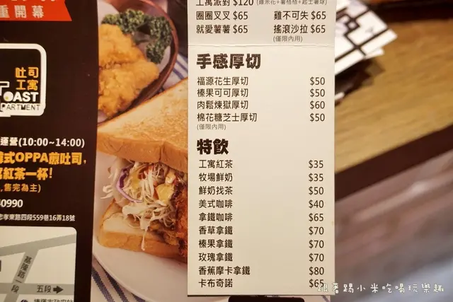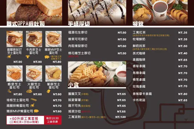 某天提早出門去吃早餐原本的目標是真芳-碳烤吐司/紅茶牛奶但走到巷子內發現了真芳-碳烤吐司/紅茶牛奶對面開了一家韓式鐵板吐司立馬先變更了目標!改天再去真芳-碳烤吐司/紅茶牛奶踩點吧菜單取自粉絲團聽從了帥氣歐巴的建議點了豬排MVP芝士蛋吐司吐司皆採用鮮奶吐司別說沒圖沒真相帥氣歐爸滴加拉圖取自店家粉絲團點好餐點找好你要的位置接下來就是等著美味餐點上桌咧公寓紅茶雖然單價有點偏高但是還喝起來茶味很足夠又不會太甜我還滿喜歡的等了數分鐘後帥氣歐爸送上好吃的鐵板吐司~陣陣香味傳來肚子都餓了起來(沒吃早餐打文章真的好孽人阿~~~~)吐司比起一般吐司略大了些經鐵板微微煎烤過!吐司保有鬆軟但有一些酥脆感滿滿的生菜絲,起司片,豬肉片還有特殊的蘿蔔片爽口的生菜搭配一些微酸的蘿蔔片真的很搭而且微酸的滋味偶爾竄出!很解膩層層堆疊的滋味~每一口味道都有自己獨立味道但是綜合在一起卻又很融合!吐司狀的木托盤真的很可愛搭配成一套可見店家對於小地方的用心一杯飲料加上一份OPPA煎吐司其實份量吃起來真的還滿足夠的如果胃袋再更大一點的朋友+60元升級套餐(公寓紅茶+沙拉或是脆薯)OPPA煎吐司口味真的很不錯~讓我想起之前在釜山大學前吃到的吐司目前飛不到韓國吃!那直接來韓式鐵板吐司-吐司公寓就可以回味美味也很棒喔~趁著前一批客人剛離開前補開的空景!韓式吐司口味真的很不錯有機會一定要帶老公來嚐嚐…查看更多