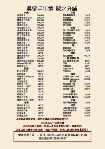 台北日式居酒屋串燒經典代表【吳留手串燒居酒屋-隱 麗水二店】烤功一流,食材新鮮有品質,服務親切,上菜快速,今晚我想來點清酒配串燒!上個月去了超好吃的吳留手麗水店今天再來隔壁的吳留手-隱 麗水二店看看二店多了生食、壽司和隱藏版菜單想喝酒就來這裡!#大安區居酒屋東門站美食 【吳留手 隱 麗水二店】在2020年9月底默默地開始營運了……因為麗水店座位有限,希望提供更好的用餐環境,所以在麗水店旁開設「隱」二店,和麗水店只隔兩間店面的距離。麗水二店增加居酒屋的料理豐富性,餐點除了串燒、生魚片,還有平常來用餐看不到的「隱」藏版菜單,所以命名為「隱」。而且「隱」提供了更多酒水菜單,要以美食美酒療癒身心,這裡更適合。▼上了二樓,多以半開放式包廂為主,接著,就是旁坐的滿座風聲,乾杯隨起。 【吳留手菜單】串燒、燒烤、沙拉、炸物、湯、炒物、甜點、酒、飲料皆有,價位大多介於$100多,和坊間居酒屋差不多。店內座位有限,每人低消$500 自帶酒,每人低消$800 加收一成服務費。 ▼清酒的選項豐富,我很滿意。 【胡麻沙拉】$160 【隱刺身】$4004~5種的生魚片組合,食材精挑細選質量新鮮。 【海膽手捲】$220/貫一出場就得到歡呼聲的海膽手捲不只賣相好,吃起來也過癮!海膽鮮美度符合居酒屋的水準,物有所值。 【比目魚鰭邊壽司】$120/貫炙燒比目魚油脂潺潺滴下包裏著米飯將這個小油包送入口中,火燒過的焦香和油香讓魚肉直接化開值了!超喜歡! 【清酒-一滴入魂】$3200/1800ml【清酒-大七箕輪門】$4300/720ml在吳留手只要點滿低消$800/人,可就以免收開瓶費,超划算! 【酒蒸蛤蜊】$280蛤蜊太鮮太肥美,滴出來的湯汁混合著昆布簡直變高湯,被大家搶著吃乾抹淨! ▼吃完酒蒸蛤蜊後,再來口清酒爽雙~~! 【鹽烤牛小排】$100/串吳留手經典必點!菜單的推薦完全超出我想像的好吃,而且還會按照人數推薦點幾串合適。而且一定要趁熱吃,要不浪廢了主廚的用心。吃下的第一口,完全真的能體驗到,從挑食品,接手,下廚,門門把關,完全就是百分百用心對待過的一道料理讓人第一串就有神仙般的味蕾體驗。 【厚切牛舌】$280吳留手經典必點!很少在居酒屋能吃到厚切牛舌,烤得如此彈跳,又帶有脆度,入口滿嘴的Q彈和焦香厚切牛舌的美妙,完全驚豔! 【培根捲鮮干貝】$130/串培根的香氣和鹹味,替干貝增添了豐厚海味一圈海陸套餐在咀嗣嚼中盡情釋放,實在太好吃了! 【鹽烤雞肉蔥串】$60/串帶皮雞腿肉夾著蔥段的清甜兩種風味的混搭,又嫩又香,豐腴的雞汁在口中四濺,就不信你不愛! 【海老鹽燒】$90/串居然有已經剝好殼的,那我就接受他的好意!肉鮮彈牙肉質沒話說。 【鹽烤雞胸軟骨】$100脆脆脆脆脆脆脆 【鹽烤腳踝軟骨】$100上一盤是市面上常見的雞軟骨,但這盤也是雞(腳踝)軟骨,厲害了吧!焦香酥脆,超級下酒,必點! 【鹽烤松阪豬】$65/串QQ彈彈脆脆的,沒有過多的調味最能吃到食材原味擠點金桔更酸爽有層次感。 【明太子山藥】$200明太子醬要擠得漂亮也是一種功夫,再用噴槍把山藥上的明太子噴得香香的,和山藥融為一體,太好吃了。 【鹽烤櫛瓜】$50/串蔬菜要烤得好吃,火候及調味很重要!這櫛瓜很可以,連平時不吃蔬菜的朋友們嗑光光來表示它好吃! 【帶皮玉米筍】$90肉肉吃多了就是需要來點時蔬的甜美,沾鹽巴就很好吃 【香烤中卷】$380這隻infinity squid真是圈圈到天邊長度是鄉民尺寸的中卷肉質Q彈細膩,擠上檸檬是極度鮮美啊! 【牛肉炒飯】$180不要看它其貌不揚,必須得說,神好吃! 【松阪豬炒水蓮】$140色澤翠綠的炒水蓮,脆口不膩,炒了小辣,味道整個連升兩級! 【冷萃生茶】$80《蛋寶543》【吳留手串燒居酒屋 隱 麗水二店】其實整體不差,但難免費拿來麗水一店比較,個人還是比較喜歡隔壁的吳留手串燒居酒屋-麗水店有串燒店的純粹與極緻,但如果喜歡吃居酒屋的多樣與變化性除了串燒之外還想來點生食握壽司和隱藏版菜單或是想要更多酒品選項,那就推薦到二店「隱」了。…查看更多