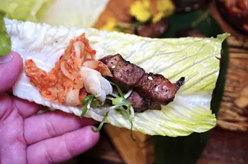 吽Home燒肉位於大安區,在網路評語不俗,本來是看到介紹,想要來吃套餐,可惜他們已經換了餐牌,取消了套餐,一律單點,幸好不貴餐廳位置頗多,裝潢走工業風,一邊吧枱,一邊大枱,有點像酒吧。如果坐吧枱,會有店員專門招呼、代烤。坐其他大枱也放心, 雖然店員都很繁忙,但遇到難烤的,或者看到客人有需要,都會主動幫烤餐牌供應前菜、蔬菜、黑毛和牛、牛肉、羊肉、豚肉、雞肉、海鮮、飯類、湯品等,單價不高,跟一般居酒屋差不多,而份量不會太多,那麼即便人少,也可以多嚐幾款。看我們沒有什麼頭緒,店員都有作出介紹,因為我們一整天都吃了好幾餐,大概晚上十點鐘才來到吃宵夜,並沒有點太多,就淺嚐,連飲品、加一服務費就吃了NT1500,兩位。點餐後,店員幫我們準備好炭爐,炭爐烤特別有風味。頭頂上有一顆大燈,讓食物看起來更吸引!牛肉特選組合 NT480店員的推薦,這組有特製鹽醬牛肉、松露角切牛小排、特級無骨牛小排。因為是組合,我相信每款份量應該比單點來得少,作為參考,牛肉類單價NT160-320。特選組合擺盤精緻,牛肋條做成花的形狀,烤肉店居然也用乾燥花,可見乾燥花的用途很廣很無敵三款牛肉味道也不錯,無骨牛小排肉質結實,嚼勁十足,牛味濃郁,簡單用鹽醬調味已經很出色以往在香港燒烤很少會點牛粒,比較抗拒,因為牛粒不容易烤熟,又容易濃。這邊店員有幫忙烤肉,所以肉沒有被我們搞跨(哈)。松露牛小排就是牛柳粒,口感嫩腍,完全不老不韌,肉汁豐富,松露味道不會蓋過肉香鹽醬牛已醃過,脂肪較牛小排多點,分佈平均,共四片,厚薄適中,最腍身是這款。畢竟用醬醃成,會比較重口味,所以吽的肉類,基本上不用沾醬料。鹽蔥牛五花 NT185有六片,已醃漬及鋪滿蔥花,牛五花入口不會很油膩,烤一下就熟,將兩邊連蔥花夾起,簡單美味嚴選厚切松板豬 NT180有六小條,這款是鹽醬,還有另一款用上椒鹽醃。松板豬口感爽脆起司奶香雞腿肉 NT130這邊用新鮮雞肉,除骨去皮,約有六、七件,配上芝士忌廉。雞肉連芝士醬一起慢火烤,待溶化後淋上雞腿肉。這份雞肉是店員幫我們烤,烤得外脆內軟,雞肉嫩腍不乾柴,芝士味道香濃,帶點奶油香,難怪店員說這個是招牌之一,建議要點啊北海道干貝 NT180共兩大粒,預先加上黑椒、白芝麻,烤熟後大小也差不多,沒有縮水。貝肉嫩腍,價錢也可以接受啊。Home日式烤飯團 NT60烤飯團已經烤好上桌,沾上海苔粉,飯粒經炭火烤至焦脆,飯團中還有三文魚肉,煙煙韌韌,60台幣,很划算。飲料:查看更多
