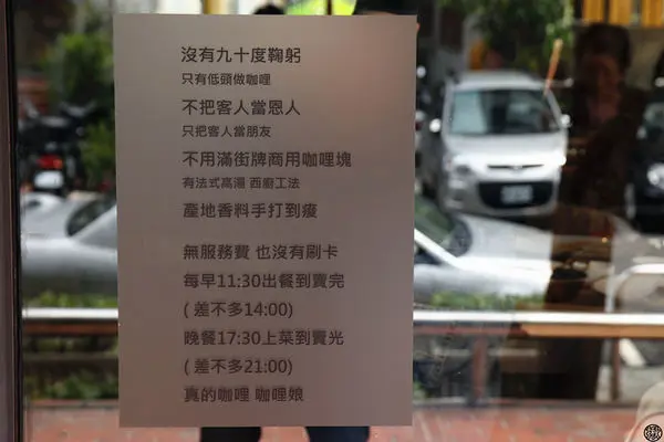 店內氣氛:★★★美味程度:★★★再訪率:★★★每次講這家店名的時候都會被朋友說:你幹嘛罵髒話 XD咖哩娘是我愛店鬍子餐酒的跨界展店,一直很想來試試咖哩娘位於小巨蛋附近,從捷運小巨蛋站5號出口走路約8-10分鐘附近有一些餐廳,但幾乎都是住宅區店面蠻大的,黑色的招牌頗有質感點餐方式很特別,先看牆上的菜單再從桌上的鐵牌&木牌中找到對應的菜色,將牌子交給店員鐵牌是主餐,木牌是加點的配菜、甜點或飲料價位介於$280-$980之間,蠻好奇$980的咖哩到底有多厲害豬肉比較特別,有分兩種:咖哩娘豬是炸豬排佐起司醬,咖哩娘南歐煨豬是燉豬肉咖哩娘豬($280)長方體的飯看起來很像米糕 XD飯是用彰化台梗九號米,Q彈飽滿、不會太黏咖哩不是用咖哩粉或咖哩塊,而是直接用香料混合法式高湯,調配而成的歐式咖哩,是種市面上比較少吃到的味道不像日式這麼甜,也不像印度咖哩這麼辛辣,味道比較多層次,但咖哩味道相對不是這麼濃厚,第一次吃的人可能會有些不習慣炸豬排皮蠻酥的,肉質普通,上面的起司醬有點太甜咖哩娘雞($280)雞肉是香煎雞胸肉,完全不乾柴!很難相信是雞胸肉,非常嫩店內座位不少,裝潢是黑色調搭配木頭桌椅餐點吃起來都有種很健康、新鮮的感覺但份量不多,價格相對起來偏高些…查看更多