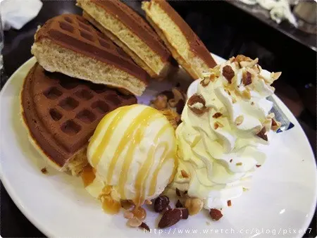 自從在米朗琪咖啡館吃到超美味的鬆餅後, 一整個念念不忘,想在離開台北前再回味 一次那迷人的鬆餅。當時已經到台北車站附近, 加上耳聞咖啡弄的鬆餅不輸給米朗琪, 於是抱著期待的心情前往咖啡弄站前店, 希望吃完甜點帶著滿足的心情回家。咖啡弄站前店的生意非常好, 雖然外頭下雨又是平日, 店內還是客滿,需要候位, 排在我們前面大概有三組客人, 本以為很快就有位子,結果還是等了超過半小時。在等位子的過程已經先研究好Menu, 所以一入座馬上就請服務生幫我們點餐。2人的下午茶: 香蕉巧克力冰淇淋鬆餅、桂圓紅棗茶、綜合咖啡。香蕉巧克力冰淇淋鬆餅(180)光從外觀來看,鬆餅的表面無光澤感, 猜測應該不會很脆,刀子切下去彈性不佳, 有點難切,心中一驚:不妙,這鬆餅應該很失敗。嚐了一口後,果然不出所料, 外層不脆以外,鬆餅也非常乾而不Q軟, 就算是沾了冰淇淋、卡式達醬、或巧克力醬, 也難以彌補乾硬鬆餅體的缺點。我試圖弄一口沾滿融化的冰淇淋, 不行,還是難以下嚥,只好放棄。 這盤鬆餅最後兩個人還是吃不完, 不是份量太多,是真的不想吃完他。比較圖-米朗琪的草莓冰淇淋鬆餅。桂圓紅棗茶(160)桂圓紅棗茶已經調整好甜度,桂圓的味道相當濃郁, 非常好喝,另外還附上幾顆未剝殼的桂圓, 我就直接拿來吃掉了~XD綜合咖啡(130)這是手工單品咖啡,隨著咖啡附上兩片手工餅乾。 咖啡喝起來的酸度與香氣很不平衡, 只喝一口就覺得不甚喜歡,最後都喝桂圓紅棗茶, 不太想碰這杯咖啡了。 服務方面,咖啡弄的客人數與服務生比例, 很明顯地服務人員偏少,而專業度也不如米朗琪, 咖啡知識與餐點介紹方面需要加強, 但是服務態度都還不錯,所以這點可以接受。用餐環境非常擁擠不舒適,鬆餅與咖啡很不OK, 惟一可以稱讚的就是桂圓紅棗茶, 以這樣的環境與品質,不太有再訪的可能。無論是用餐環境,還是餐點品質, 一整個輸給米朗琪太多太多了。用餐時間限制1.5小時,低消一人一杯飲料,服務費10%。咖啡弄(站前店) Coffee Alley地  址:台北市中正區館前路18號2樓 電  話:(02)2388-3000 營業時間:12:00-23:00(最後點餐22:00)查看更多