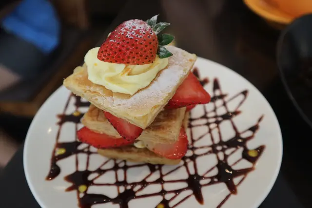我想大家對咖啡弄一定非常熟悉 在前幾年火速爆紅成為排隊名店 大家對裡面的招牌草莓鬆餅也是拿她跟米朗期做比較 但今天要介紹的當然是我自己比較喜歡的甜點囉 請各位繼續看下去吧 菜單連結 草莓歐雷 就是草莓牛奶囉 酸酸甜甜的口感 上面奶泡很綿密 還有草莓微酸的香氣 滿好喝的囉 冰可可亞 喜歡上面有奶泡的飲品哈哈 味道就普普囉 喝到最後會太甜就是了 牛肉三明治 份量頗大一份 麵包有點太硬但是裡面內餡味道很夠 嘴巴要張很大才塞得進去哈哈 很有飽足感囉!!!! 冰淇淋紅茶 上面是香草冰淇淋 我喜歡直接挖起來吃 還頗好吃的不會太甜 然後融化後跟紅茶也很搭 不會有紅茶的澀味 很順口 巧克力香蕉鬆餅 鬆餅很大很軟 可惜的是香蕉不夠 吃到最後會不想吃只剩鬆餅滿可惜的 不過我之前去吃他們的草莓鬆餅就不會這樣 所以個人建議下次還是點草莓口味好了 本日最推薦的就是她了!!!! 法式草莓千層 有沒有很漂亮 完全不想破壞吃掉他 因為真的美呆了 連下面也用巧克力醬畫的美美的 根本藝術品了阿 千層口感酥脆 裡面的奶油的甜中和了草莓的微酸 吃了真的讓人覺得幸福 總結 每次去咖啡弄草莓千層都是我的必點 雖然小塊又有點貴 但吃了真的心情好好 喜歡法式千層的朋友千萬別錯過囉!!!!查看更多