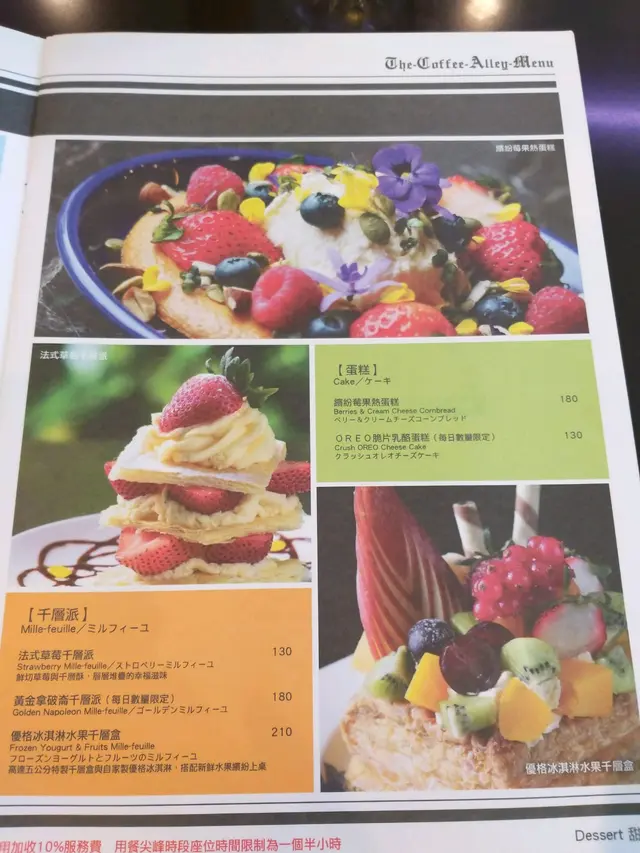 好久沒踏進台北車站附近、好久沒發文部落格已長草、好多的好久好久…今天要來發文了!!『咖啡弄 Coffee Alley』跟『米朗琪咖啡 Melange Cafe』是台北鬆餅界的名店其中之二臨時透過線上訂位,發現『米朗琪咖啡 Melange Cafe』只開放預約17:00以後的席位那…全時段可預約的『咖啡弄 Coffee Alley』,理所當然成為我這天"下午茶"的入選餐廳!!(尖叫聲。尖叫聲。尖叫聲。。。)竟然入坐店內唯一「包廂」座位!!!!!!當VIP的感覺相當不錯的不錯,小孩在一旁吼叫也不用怕吵到別人 ~ 這位置真的很速西ㄚ!!!需要點餐時還只需要按下牆壁上的「服務鈴」開關,搞的好像搭飛機按服務鈴的感覺(嘻~)像報紙一樣的menu,拿著它點餐忍不住覺得自己是個文青 ~ 哈哈哈……(線上看菜單請點我)註:每人低消為一杯飲料,6歲以下兒童免低消雖然來這裡點"飯"吃感覺很有事,但實在是午餐沒吃好餓啊 ~ 不來點正餐都要昏倒了!!!!這道干炒咖喱黑豚飯nt$200意外的讓人覺得美味,咖喱醬料加上豬肉末、馬鈴薯丁、青豆…拌炒收乾,半乾濕的口感配上白飯又香又辣又開胃為了避免小孩拒吃,保守選擇沒有人不愛的香蕉巧克力冰淇淋鬆餅nt$180四片厚實、帶Q彈嚼勁的鬆餅,抹上好好吃的巧克力冰淇淋、再佐上一點卡士達醬入口真是幸福超級嗜甜者更別忘了要再淋上巧克力醬,這一盤全吃下肚鐵定飽到爆炸,所以Lady們用分食最好吐司裡夾了雞肉塊、火腿片、蛋片、生菜、蕃茄(有3塊)的總匯三明治nt$180,豐富配料讓三明治的口感很有層次、且因為生菜量不少所以吃起來頗清爽此外,餐點還附了"多力多滋"以及"雞蛋沙拉",整體來說美味度是中規中矩路線啦!!!吃甜甜的食物,還是覺得搭配鮮奶茶系列最match,所以選上阿薩姆紅茶(+牛奶)nt$150茶味不澀、香氣淡淡的,如果牛奶可以大瓶一點會更讓人滿意呀!!!!酸度、香氣滿溢的冰鮮果茶nt$180,喝起來味道濃郁、倒進冰塊進攪拌著喝相當剛好唯獨一點,大家要記得 ~ 上桌一陣子之後茶包要先取出,否則喝到最後會有點澀澀的感覺有點奶味兒、有點沙沙的OREO餅乾末的OREO碎片冰沙nt$180甜度剛剛好,在這炎熱的天氣之下喝它一杯,真的是心涼脾肚開!!!!查看更多