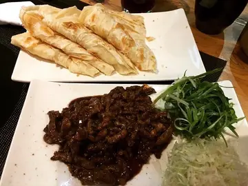 之前就來吃過一次, 那時品川蘭才剛開始這間店後來還有得過CNN推薦的八大必吃牛肉麵之一蠻特別的品川蘭忠孝店就在忠孝東路四段216巷內, 從216巷進來第一個巷子左轉不久就會看到環境上與之前來沒有差別香煎帶骨牛小排麵京醬豬肉絲附斤餅鮮蝦雪花牛肉捲●鮮蝦雪花牛肉捲這是近期推出的新菜色作法的話就是使用薄而帶點油花的牛肉片中間包著洋蔥, 蔥絲, 黃瓜, 與鮮蝦作成的牛肉卷有把它拆開實證一下●香煎帶骨牛小排麵很特別的麵, 麵上片鋪著六七片很大片的帶骨牛小排根據說明, 湯頭比較接近紅燒「川系列」採用帶皮紅甘蔗、黑柿番茄、牛大骨及多種中藥材熬製而成,湯頭呈現甘甜醇厚的特質而這碗則更濃厚些, 是搭配中藥食材熬製多時,醇厚口感不膩味,再以黑胡椒提味屬於中藥味較濃一點口感的湯頭根據資料, 牛小排以小火現場煎製而成, 吃的時候略帶些焦香, 但要注意如果泡的越久有軟掉的危險所以先吃肉乃是上策, 肉的份量多, 肉質也不賴, 吃來蠻過癮這樣想想其實它有點類似『排骨麵』的設計理念, 只是吃的從煎排骨改成牛小排, 並搭配牛小排肉質與口感把湯頭作了些調整, 口味重些, 也蠻有創意的麵條的話是使用自製的手工寬麵說明是這樣的, 採用台灣本土有機小麥研磨的新高山麵粉,與澳洲黃金小麥以7:3的黃金比例結合,採用多道延展工法製作出彈牙的麵條,寬麵厚實,細麵滑潤,感受專屬於麵食的麥香味。我個人也是吃麵較喜歡口感Q彈一點的寬麵, 喜歡麵條要有點嚼勁不過這天吃的麵較軟些●京醬豬肉絲附斤餅這道可是有名的北方菜北平館子裡多半會附京醬肉絲本來就是很下飯的菜再把它包到好吃的餅子裡, 捲起來, 酥脆可口京醬肉絲則重點在要有油香, 使用香油搭配甜麵醬炒到香氣四逸, 再與醃好的豬肉拌炒上色這天的肉絲稍有點過甜, 或者是我們拍照玩太久吧,欠些香氣斤餅經由特殊的捲餅及打餅技術,創造出酥柔口感,乾烙過後散發誘人的香氣這個斤餅我喜歡酥脆吃起來就是好, 直接單吃它也很爽快包起來試試以下為自費吃的,同場加映●梅釀蕃茄用了比較酸的梅子醃的蕃茄, 酸度高了些, 不過去油解膩蠻不賴的適合吃到一半再吃會更好●晶鑽牛肉凍本日最佳, 好吃的牛肉凍, 味道夠, 鹹度也適中, 開胃會讓人一口一口一直吃, 包在餅子裡吃也好, 直接吃也很棒, 缺點大概只有太滑溜, 筷子使用技巧不好會掉要多小心●總評晶鑽牛肉凍與斤餅大推, 牛小排肉質好煎的也好吃!!