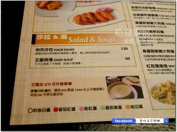前幾天經過的時候覺得它好面熟 距離上一次吃已經超過一年了耶!! 看到店門口的小黑板上寫著.. 商業午餐升級套餐 + 20元就有麵包、湯、飲料 真的是太划算了啦!!! 以黑、白為主的裝潢 陽光灑進來顯得格外明亮 牆上的畫都好漂亮喲!! 連相框都精心挑選呢!! 旁邊這 2 桌都是女孩們的聚餐 右邊是 2 個媽媽各自帶著女兒來享用下午茶 店內的兒童座椅跟外面看到的不太一樣 往樓下的樓梯轉角處 這個下樓讓人無法只有專心走路 因為有好多可愛的裝飾 洗手間也太夢幻了 還有一些溫馨的壁貼 Menu 哈克廚房..滿足您的每一個味蕾 前菜、沙拉、湯、飯、麵、烤餅、牛排、帕尼尼 不管是早午餐、下午茶或是晚餐 餐點有很多選項..超適合約朋友聚餐呢!! 蜂蜜辣醬雞翅 NT 150 元 這道炸雞翅是上次來也有點過的 因為太好吃了..所以這次還想再點 沒有外層多餘的裏粉..仍然薄脆 有蜂蜜的香甜 + 微微辣 鮮嫩多汁..超開胃!!! 明太子干貝麵 NT 400 元 超大顆的北海道干貝 就已經讓輕盈寶寶睜大雙眼..哇~~~~ 香濃的白醬搭配依附在麵條上的明太子 充滿海味的鮮甜..而且干貝好 Q 彈啊!! 鮮蝦起司烤薄餅 NT 280 元 蘑菇、洋蔥、鮮蝦搭配法式鄉村醬 加上厚厚的查特起司 + 帕馬森起司 底下的薄餅薄得比餅乾還要薄耶!!! 用料大方又實在 吃得到香濃的起司還有 QQ 的鮮蝦 哈克的 pizza 是少數輕盈寶寶會乖乖把 pizza 邊邊吃掉 因為邊邊好薄好脆..有意猶未盡的感覺呢!! 王子說..我一個人就可以吃一整個囉!! 青醬海鮮燉飯 + 50 升等焗烤 NT 380+50 元 三個好大的淡菜就排排站在旁邊 焗烤上面撒的是松子耶!! 薄薄一層起司焗烤 好香好濃的起司味啊!!!! 起司跟青醬真的好搭喔!!! 還有新鮮整隻的蝦蝦、花枝 海鮮沒有過熟..還保有 Q 彈的口感 香蕉草莓舞曲 NT 240 元 用料真的非常實在 可以明顯的感受到香蕉跟草莓在口中跳舞 真的狠香又狠濃的奶昔..好好喝喲!!! 曼波水果茶 NT 180 元 哈克廚房使用的是德國 D & B 有機的花草茶喲!! 裡面有:洛神花、蘋果乾、木瓜、接骨木果 黑醋栗、藍莓、草莓、向日葵、矢車菊 茶的顏色是鮮紅明亮的..微微的酸甜 聞起來是香甜的水果味 但喝了才發現其實沒有加糖 喜歡甜一點的朋友旁邊都有附糖包可以自己加喲!! 很適合在飯後喝..可以去油解膩 第二次造訪哈克廚房還是很滿意值得推薦 "輕盈寶寶FB粉絲專頁https://www.facebook.com/princessyabe"…查看更多