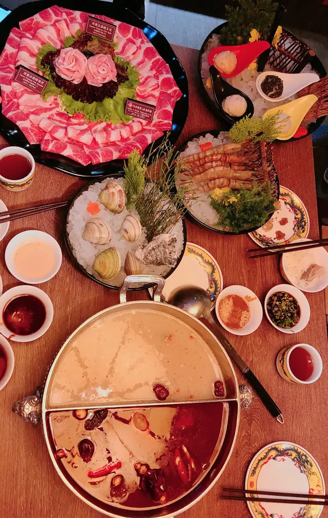 忠孝敦化站、明曜百貨旁的【問鼎 皇上吉祥 宮廷火鍋-忠孝店】是馬辣集團旗下的火鍋店,以浮誇奢華、中國宮廷風聞名,還有川菜可搭配吃鍋更豐盛!這裡還提供龍鳳袍古裝體驗、按摩椅、川劇變臉秀等浮誇服務,還有16款口味的哈根達師吃到飽,讓吃鍋更有樂趣! 【問鼎麻辣鍋】店內裝潢風格古典雅緻,設有4~6人的座位,也有10人包廂,適合朋友聚餐、家庭聚會、慶生…等。 ▼設有8~10人的圓桌。 ▼壯觀的簽名牆,有很多藝人明星都來過~ ▼醬料區提供多種醬料,可自由搭配使用。 【問鼎 菜單】手機刷QR Code點餐多款鴛鴦鍋湯頭自由配,開鍋費$158/人,含16種口味哈根達斯、醬料20款、台梗9號米吃到飽✔️每人低消含開鍋費為$350✔️包廂低消$7000,可開2鍋✔️用餐時間為2小時 (問鼎菜單) 進入店內用餐,首先會招待一壺「熱茶」。 【2人豪華海陸套餐】$1580今日我們是2人用餐,選這個剛剛好,不用煩惱要吃什麼! 【麻辣鍋+蔬菜鍋】我們今天選的湯底是「麻辣鍋」旁邊「蔬菜鍋」是附贈的。 ▼麻辣鍋底▼微麻微辣帶有中藥香氣,香>辣>麻我們選擇中辣,還滿溫和的,是可以喝的麻辣湯頭內含軟嫩的鴨血、豆腐,也可無限續加! ▼蔬菜湯底▼喝起來清甜,涮菜、涮海鮮都合適。 稍等一下,餐點到齊後,準備開吃囉! 【CAB安格斯黑牛】10片/250g肉色、油花都很不錯,放入麻辣鍋中涮煮,軟香微麻辣又帶點咬勁。 【活菌豬五花】8片涮入麻辣鍋的豬五花,吃起來有肉感,且不柴不油膩。 【豪華海鮮5品】這盤海鮮拼盤裡有:蝦子 花枝 生蠔 蛤蜊 鱸魚 涮鍋後吃起來還算鮮美,只是份量有點少! 【手工餃4品】x2搭配鍋物,吃起來還不錯,餃類、丸子類都是一人一個,套餐份剛剛好,不會太多! 【老油條】4條入麻辣鍋涮煮後,脆脆又香,還帶有微麻辣的滋味,超喜歡! 【蔬菜】套餐裡包含3款食蔬:金針菇 福山萵苣 高麗菜 【口水雞+滷肉飯】$208「口水雞」將雞腿部位改以時下受歡迎的「雞胸肉」為主角,以恆溫方式長時舒肥熟成,再淋上以朝天椒、青花椒、大紅袍、等調製醬汁,集麻、辣、鮮、香、嫩、爽於一身。 「滷肉飯」油潤又香,吃完很有飽足感。 ▼好康活動▼內用送白蝦優惠活動全桌其中一位身份証對中號碼,每人送10隻蝦!(今天我們免費吃了20隻蝦/2人) 【冰沙】(招待)酸甜的洛神花冰沙,去油解膩剛剛好。 【哈根達斯】這裡有提供16款冰淇淋吃到飽!想吃什麼自己選,多吃幾球就回本啦~! 【玉露綠茶(冰)】$130最後再喝個茶,休息一下,結束這飽足的一餐! 《蛋寶543》這一次來到忠孝敦化站、明曜百貨附近的【問鼎 皇上吉祥 宮廷火鍋】(忠孝店)整體的用餐感覺很不錯。這裡的用餐環境、空間舒適,還可以變裝當皇上、皇后,很有趣!我們今天點了雙人套餐並加點其它的菜,結帳金額才$2110/2人,就能吃的超飽,是間CP值高的單點式麻辣鍋店,真的很適合多人聚餐、慶生呢!可以吃的開心又飽足~推薦給大家!…查看更多
