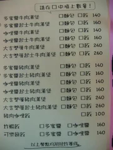 潭美颱風才離開,就迫不及待來嚐嚐美食 - 大吉漢堡食堂離 六張犁捷運站 不遠,就在信安街上OK便利商店隔壁巷子裡店外有Menu及營業時間,替想嚐鮮又怕傷荷包的饕客們一個很貼心的設置店內走簡潔溫馨路線,有20個座位,還有雜誌,漫畫,公仔佈滿整間店,進來一定不無聊隨手拿了本今年才出版的 原來我真的很瞎 就讓我邊吃邊笑了冰紅茶,冰咖啡可無限取用, 我只試了咖啡,有點淡,可以再濃烈一點旁邊有糖及奶油球可調和,餐具也是自取喔!!趕快來點餐了,所有漢堡都可選擇搭配麵包or飯, 我是米飯控所以選飯嚕最近還有 超級{可樂}午餐,多玻璃瓶可樂一瓶及可樂餅...說起來舌頭有點給它打結^^約莫5分鐘後,我點的 多蜜醬起士牛肉漢堡飯 陸續上菜嚕熱熱的可樂餅, 外酥脆內香軟綿密馬鈴薯,也挺大一塊的主餐上的薯條還真好吃,香脆內鬆軟,與21世紀有類似,搭配去了皮的小黃瓜沙拉,有心牛肉堡差不多是M牌的3倍厚,上面還躺著一片起司牛肉有點小鬆不緊實缺少點彈性,若經過摔捏拋打會更緊實,滿足咬肉的快感多蜜醬味似 日式照燒醬還有淡淡的咖哩餘韻 不甜膩,沒吃過的味道,不失為一特色差不多兩碗的飯量,一整份女生吃會太撐阿~~~~膩看看膩看看牛肉有夠厚拉~~~若不想再吃M牌的乾扁牛肉,或走米飯混搭都可以來試試最近又有滿百折百優惠,實在很優惠,當然要來試一下拉!!!…查看更多