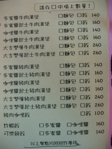 潭美颱風才離開,就迫不及待來嚐嚐美食 - 大吉漢堡食堂離 六張犁捷運站 不遠,就在信安街上OK便利商店隔壁巷子裡店外有Menu及營業時間,替想嚐鮮又怕傷荷包的饕客們一個很貼心的設置店內走簡潔溫馨路線,有20個座位,還有雜誌,漫畫,公仔佈滿整間店,進來一定不無聊隨手拿了本今年才出版的 原來我真的很瞎 就讓我邊吃邊笑了冰紅茶,冰咖啡可無限取用, 我只試了咖啡,有點淡,可以再濃烈一點旁邊有糖及奶油球可調和,餐具也是自取喔!!趕快來點餐了,所有漢堡都可選擇搭配麵包or飯, 我是米飯控所以選飯嚕最近還有 超級{可樂}午餐,多玻璃瓶可樂一瓶及可樂餅...說起來舌頭有點給它打結^^約莫5分鐘後,我點的 多蜜醬起士牛肉漢堡飯 陸續上菜嚕熱熱的可樂餅, 外酥脆內香軟綿密馬鈴薯,也挺大一塊的主餐上的薯條還真好吃,香脆內鬆軟,與21世紀有類似,搭配去了皮的小黃瓜沙拉,有心牛肉堡差不多是M牌的3倍厚,上面還躺著一片起司牛肉有點小鬆不緊實缺少點彈性,若經過摔捏拋打會更緊實,滿足咬肉的快感多蜜醬味似 日式照燒醬還有淡淡的咖哩餘韻 不甜膩,沒吃過的味道,不失為一特色差不多兩碗的飯量,一整份女生吃會太撐阿~~~~膩看看膩看看牛肉有夠厚拉~~~若不想再吃M牌的乾扁牛肉,或走米飯混搭都可以來試試最近又有滿百折百優惠,實在很優惠,當然要來試一下拉!!!…Read More