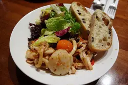 近年的台北迎來了餐酒館的風潮,手頭上待嚐名單推積起來也有好些,這回選了大嗑西式餐館做為某攤歲末聚會的地點,都訂好位才曉得當天網上剛好公佈了由網友推薦選出的十間餐酒館名單,而大嗑也是其中之一。其實這餐原本是要從貓下去計畫和大嗑西式餐館選一間,但考量到貓下去的用餐限時90分鐘與傳說中的難訂位,大嗑的雀屏中選也就毫不意外了,不過訂位時電話線另一端告知假日晚餐訂六點只能吃到七點半,才想起原來大嗑也有限時,而且還是相同短暫的90分鐘,這樣的時間個人覺得稍嫌緊促,不過朋友提議吃完正餐後可以再找其他地方續攤,也是個解決方法。聚餐當日中午餐廳撥電話來,告知傍晚五點半就開始營業,如果提前抵達一樣可以用餐到七點半,雖然不了解為何當天才說明這件事,但撥電話過來的人態度挺好,加上能多點緩衝原本就正合大家的意思,就改約提前半小時抵達了。(題外話,貓下去我們約聚餐那時仍可電話訂位,目前已不提供這項服務,不過回頭想想人家是那十間名單中熱度排第一的,就算真打電話大概也訂不到...最後還是有找到其他機會造訪,將來再寫。)從捷運忠孝新生站走路到大嗑西式餐館約莫10分鐘的路程,是位於濟南路二段與泰安街交叉的巷口的三角窗店面,一樓與地下室都有座位,這天被安排在玻璃門旁的位置,老實說這位置不太好,一旦有人進出開關門都會受到影響,加上門本身也無法完全緊閉,冷風會不斷從縫隙灌進來,用餐期間還有蚊蟲飛至餐盤裡,幸好那盤菜是吃剩的,不然這餐心情恐怕是不會太好,我能理解要以這樣的價格供應該店水準的食物,在空間安排上自然得盡可能利用,桌距緊密或是略顯吵雜都難以避免,但有些座位確實就是坐起來沒那麼舒適,我們大約是20天之前,也就是提早將近三週的時間打電話訂位,或許當時能先大概說明也是一個做法,至少讓客人衡量能否接受或心裡有個底再來用餐。這是我們去時的菜單,今年三月又更新了一次,內容已有一些不同,當日特餐則是寫在黑板上,點餐時服務人員也會告知,上主餐前有先詢問要用分食或各自上餐的方式,方便拿捏出菜的時間,其他部分即使偶爾有疏漏但態度也都蠻好,所以整體感覺還算不錯,有收10%服務費。板煎綜合海鮮沙拉附麵包 280元第一道上桌的料理就讓人挺滿意,幾種海鮮的口感處理得不錯,尤其花枝和干貝我都喜歡,搭上鹹香帶點辛辣感的調味相當合拍,另外附上麵包和清爽的油醋生菜沙拉。酥炸雞翅 40元/支金黃色的炸衣不算薄而是層存在感明顯的酥脆外殼,雞翅裏頭塞的蒜味卡士達比預期來的淡口些,原本以為會是很油膩或厚重,附上的糖醋醬帶薑味,搭配起來還有點去膩的效果。蘋果騷兒 Apple Sour 210元小鴨特調 Ducky Special 250元瑞典洋梨氣泡甜酒 120元兩杯調酒比起來個人較喜歡蘋果騷兒的酸,加了奶酒的小鴨特調則是過於溫和了些,對我來說甚至有些甜膩,而洋梨氣泡酒就是玻璃罐裝的夏日蜜系列。每日例湯(附麵包) 120元這天供應的是水果玉米打成的濃湯,濃郁而香甜的討喜滋味,雖是小小一杯但挺有滿足感,還會附上一片麵包。香料海鮮燉飯佐季節鮮魚 380元季節鮮魚每日不同,這天吃到的青衣肉質細滑而味道清淡,底下的燉飯也是調味不重的類型,米粒的做法沒特別愛,搭配的櫛瓜有點厚度的口感我蠻喜歡。香煎美國Choice沙朗佐黑胡椒紅酒醬汁(8oz) 580元雖是U.S. Choice級的牛肉,透過低溫調理還是能將肉質處理到很柔軟,而且對廚房而言相對容易提供品質穩定的餐點,這種做法我能接受,口感不錯風味也不太會流失,加上價格與分量更沒甚麼好挑剔的,搭配的醬汁黑胡椒味沒有太重這點也正合我的口味,一旁的蔬菜有些帶點苦味吃不多。爐烤脆皮櫻桃鴨胸佐波特酒花椒醬汁 480元鴨胸應該是相同作法,肉質口感亦是軟嫩好吃款,看起來焦酥的外皮實際上效果不到非常強烈,整體分量給得挺大方吃來相當爽快,搭上醬汁不錯可惜沒感受什麼花椒味,添加蒜酥的口感與味道這點我喜歡,同桌們對這道鴨胸評價也都很正面。芥末白酒燴牛頰佐馬鈴薯泥和季節蔬菜 400元沒來之前看到大嗑的紅酒牛頰相當期待,不過去時已換成芥末白酒醬的版本,比較起來是清爽一些但滋味也好,牛頰夠軟帶膠質的口感不錯,襯底的馬鈴薯泥相當細滑迷人,與醬汁交融一起入口的印象甚至強過了牛頰本身,雖然做為最後一道上桌的肉類主餐是有些吃虧,但本身其實也算是讓人沒甚麼好挑剔的水準之上。蜂蜜烤布丁佐季節水果 150元烤布丁是濃密而柔膩的口感,蜂蜜的氣味並不特出,但香草與奶蛋組合仍是香甜撩人,個人認為這是三款甜點之中最安定又不失美味的一款。半熟巧克力蛋糕佐新鮮香蕉慕思 130元杯底是半熟巧克力蛋糕,上頭的泡泡則是新鮮香蕉打成的幕斯,上桌時仍是溫熱的,軟糊浸潤的口感真不是人人有愛,但確實挺特別。香草奶酪佐陳年酒醋與季節水果 130元奶酪本身質地沒那麼凝固,搭上酒醋的組合意外地挺合拍,當季草莓襯上奶甜與酸香一起入口滋味很不錯。大嗑西式餐館的食物與價格都符合我對餐酒館印象中的爽快感,和時下流行的同類型餐廳相比較,大嗑是我會想再訪的餐廳,雖然環境上的問題會期待有所改善,但至少整體還算挺開心的,故對細節處的在意感就會稍稍降低,重點是這餐大夥都愉悅滿足,已算是達成聚餐最重要的指標,另外大嗑今年也在信義區開了不同型態的二店