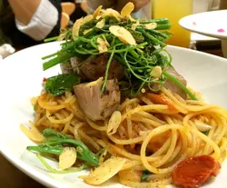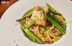 蔗燻培根蘆筍奶油義大利麵佐酥炸半熟水波蛋