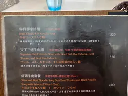係日本周圍搵拉麵食,今次嚟台灣,決心要搵一碗最好食既牛肉麵,結果喜出望外!網上介紹一乍台北既靚靚牛肉麵,但我只有時間試一間,我呢一票就投咗俾有車胎認証星星既天下三絕。 佢開係類似旺角彌敦道既忠孝東路三段一條細街入面,位置唔起眼,由大街望唔到。  冇食早餐,12點左右去到,已經要等位。我冇訂位,等咗大約20分鐘。 佢餐牌好駕勢😅 連wine pairing都有🍷麵到之前,先嚟一小碟酸菜,仲有兩樣法寶,辣椒油同牛油,唔係搽麵包個D Butter,係牛既油,擺耐咗會「擎」既。 辣油唔太辣,係「味覺提升功能」級別。 麵有三個選擇,我揀咗闊闊地既家常麵,夠傳統。 份量尚算夠,麵質幾煙韌😋👍 我就點咗碗530蚊既大晒冷 - 天下三絕牛肉麵。 我從未食過咁貴既牛肉麵🤑,如果係街坊級麵店食到兩碗加杯野飲! 牛肉除咗膽拖既牛𦟌、腱心、牛筋之外,仲有重未見過既牛尾! 講返舊牛尾,真係從未食過連皮既牛尾,塊皮仲好淋好滑,應該講話未試過食到任何連皮既牛肉😅。 失望之處就係,四樣野都只得每樣一舊,但係價錢係遂樣野加上去,所以食淨腱心或者半筋半肉會抵D,見人地唔係得一舊😒! 肉反而唔係最欣賞之處,叫做夠淋、入味囉, 味道唔係好有特色。個湯先至係重點! 平時食牛肉麵,兩大流派係紅燒同清燉,不過呢個湯介乎兩者之間,清香得嚟濃郁,唔會好似段純貞咁好似飲豉油😝 拉麵喪加豬油係慣例,今次呢個牛油先係Magic! 一加落去,成個牛香濃味去咗另一個層次😨 功效明顯過豬油既清香,咁玩法真係未試過! 食到半路,仲問我加唔加湯? 😅呢樣又係未試過! 老虎蟹都加啦🥰 佢仲加到滿一滿👍 如果日本食拉麵有得加湯就好囉! 最後我好似食拉麵咁,飲清D湯以示捧場👏😋👍估唔到牛肉麵可以有如此體驗! 原來台灣人可以將牛肉麵呢D國民美食玩到咁高層次👏😎,真係唔見香港會將雲吞麵、魚蛋粉做得咁高尚。 呢頭講呢頭散... 平心而論,你又願意俾120蚊(港幣)去食碗雲吞麵咩? 送多杯玉冰燒俾你好唔好? 天下三絕每位顧客, 食到半路都會免費贈飲呢一小杯凍飲, 唔係高粱酒🤣 係蘋果醋嚟既, 唔會好酸, 更加唔甜, 幾好飲, 有助去油解膩。紙巾提供: 有廁所狀況: 無去過溫飽指數: ***回味指數: ****翻兜指數: ***查看更多