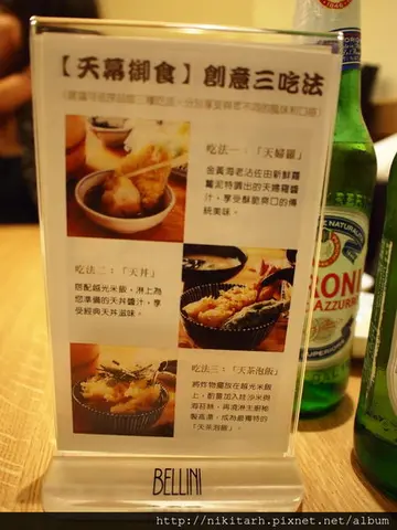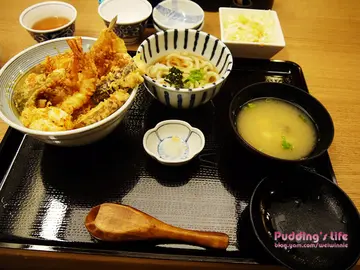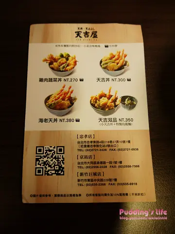「天吉屋」明明在新竹巨城就有分店但我第一次吃到它竟然在台北原因是我台北的朋友實在太愛了所以這回我們去台北玩即使她已經吃過很多次都依然推薦我們這家日式丼飯店這天吃的「天吉屋」是忠孝店位於北市美食一級戰區的216巷朋友雖然事先訂了位不過用餐時間客人滿座加上店家時間安排上好像不太順暢所以還在門口等了一會兒日式炸物店當然要來個日式風格的招牌下方寫著店家的營業時間既然還不能入座就先在門口研究一下菜單不需要思考太久的時間因為主餐只有推出5種所有餐點都會附上"開胃沙拉"但其實就是加了醬的高麗菜絲"牛蒡茶"味道香甜是無限暢飲兩樣小菜直接放在桌上自由夾取因為對漬物沒有太大興趣就只各吃了一口嘗嘗味道牆上的手繪餐點畫得還不錯餐點本身價位不算低且需另收10%服務費唷天吉丼 NT.300滿滿的炸物好豐盛讓我都快看不到碗裡還有飯的存在內容物有海老三尾/白身魚/厚身花枝茄子/青椒/地瓜/溫泉蛋厚身花枝吃起來飽嘴Q彈半熟的溫泉蛋是用炸的...拌飯吃超濃滑如果不敢吃半熟也可要求全熟蛋喔小配角之一的味噌湯天幕御食 NT.400金黃色的炸衣讓炸物看起來美味極了這一盤裡有海老三尾/白身魚/真鯛花枝洋蔥酥/茄子/青椒/地瓜米飯是用飯桶直接上桌想說份量會不會很驚人其實還好啦...薄薄一層朋友她食量不大都還可以續桶說"天幕御食"有三種創意吃法第一吃:單獨吃"天婦羅"的脆口第二吃:將特製"天丼醬汁"加至越光米飯上第三吃:加入秘製高湯享用"天茶泡飯"天吉雙品 NT.350(小天吉丼+特製烏龍麵)小天吉丼的炸物和天吉丼幾乎一樣只不過是少了一隻炸蝦天吉屋好吃的關鍵除了各式天婦羅外我覺得"醬汁"是最大的功臣雙品就是多一碗讚崎烏龍麵不過麵條和湯汁都只有中等水平所以下次大概只會再點飯類產品目前天吉屋只有三家分店兩家在台北一個在新竹BIG CITY的7樓如果它價位再平民一點或許我會常去巨城吃吧✰ 天吉屋地址:台北市忠孝東路四段216巷27弄10號1F電話:02-2721-3328時間:11:30~14:30(假日至15:30) 17:30~21:30…查看更多