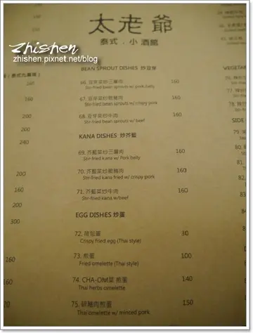 今天介紹的這間「太老爺小酒館」,是來自於曼谷CABOCHON旅店裏的同名餐廳,標榜風味和泰國本地如出一徹,簡單來說就是"道地"為了想要一嚐這標榜這原汁原味的太老爺,和平常在台灣吃到的泰國料理差異到底有多大,讓魯有莫大上門探索的興趣太老爺小酒館位於舊中山足球場、花博園區,現在則是在MAJI MAJI集食行樂的主題餐廳區裏頭,因為當天魯的摩托是停在圓山捷運一號出口旁,如果是從捷運一號出口方向進來的話,太老爺應該就是在MAJI集食行樂裏穿過美食街的主題餐廳區最北角,希望我這樣說明大家聽得懂XD(往中間走就對了Orz)太老爺小歸小,不過裏外都還滿有設計感,營造出滿不錯的用餐氛圍,唯一魯比較介意的,是因為魯是前陣子上門用餐的,當時天氣不如現在涼爽,所以內外感覺都不算通風,有點小小悶熱,要是夏秋上門的話可能怕熱的人會比較吃力,不過如果依現在這樣子的天氣的話可能就沒這個問題 ΩMENU太老爺以小酒館為名,提供的料理就有點像是在日式居酒屋和一般喝酒的地方一樣,東西量偏少走重口味、多樣化路線Ω烤東北E-SAN口味 酸香腸Grilled Northeastern(E-san) pork sausage 180塊大洋酸香腸口感比較軟,酸香風味明顯,但也因為酸,香腸不會太油膩的感覺,風味滿特別的,搭配高麗生菜和蒜瓣味道不錯Ω老虎淚/烤牛胸肉Grilled beef(brisket part) 220塊大洋魯忘了問為何這烤牛胸肉又稱老虎淚,這名字實在有趣!不過這道是請店家小姐推薦的,品嚐起來感覺也相當不錯牛胸肉帶點筋油,油脂不會太過,肉本身甜度和肉味都還不差,點點乾辣椒粉帶上香氣,單吃嚐肉味,搭酸甜醬汁吃更是涮嘴Ω涼拌青木瓜沙拉(泰式)Papaya w/dried shrimps & peanuts 120塊大洋涼拌青木瓜沙拉剛入口時酸甜,辣味漸顯,味道清爽但又有層次,加上青木瓜絲的脆彈口感沒話說,即使不用搭配主食享用,也完全不會膩口Ω炸蝦餅Deep-fried shrimp cake 180塊大洋炸蝦餅主要是很香,口感則是比較緊實!Ω太老爺炒飯TLY fried rice with squids and beef 180塊大洋太老爺炒飯吃起來香而且帶辣,蔥花、四季豆和中卷段帶香帶口感,而且米粒的口頭不會太軟,所以單就炒飯本身其實味道就還不錯,有豐富感味道也不單調!而蓋在上頭的炸荷包蛋酥香不老,油香蛋香之餘也為炒飯再加上幾分Ω炸鴨嘴Deep fried duck mouth 150塊大洋瑪炸鴨嘴也是店家小姐推薦,整個鴨頭和部份的鴨脖子炸得老酥,骨頭酥脆的一咬即碎,妙的是沾一旁的酸甜辣醬汁竟然相當合味,十足下酒菜Ω椰奶酸咖哩雞Coconut curry w/chicken 160塊大洋椰奶咖哩的奶香濃郁醇厚,當我們剛要沈浸在奶香味中時,尾韻的酸香又碰然出現,驚喜!雖然當中的雞肉塊嚐起來還軟嫩的,不過仍然難掩椰奶酸咖哩的鋒芒…當湯喝也很讚啦!Ω九層塔炒蛤蠣Stir-fried Thai basil w/clams 160塊大洋炒蛤嚐得出新鮮,熟度也掌控恰到好處,和台式炒蛤不同的是,醬香較薄,但相對清爽、鮮味明顯就如魯文中所述,老太爺小酒館的料理量較少,相對價位偏高,標榜的道地泰國風味魯沒實地到過泰國所以不知道算不算地道,但和以往魯在台灣嚐過的泰國料理餐廳不僅樣式不同,風味也的確有所差異,明顯地較酸較辣,但味道魯滿能接受而且喜歡,所以如果是以喝酒聊天為前提,想要有重口小菜可以搭配,但又想跳脫一般思維試試不同風味的話,老太爺應該可以納入選擇名單之一喔…查看更多
