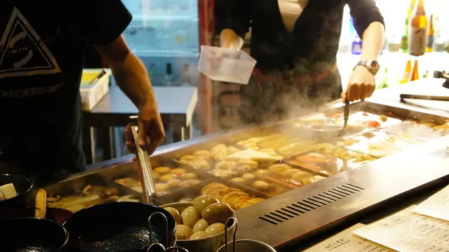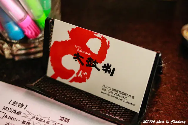 【台北內湖.葫洲站】太鼓判ODEN BAR-內湖超人氣宵夜 日式關東煮x燒烤 奇奇一起玩樂趣等級42016-01-06616 瀏覽 關注 大嫂一直推薦我說內湖有一間老闆娘很正的關東煮XD,一定要去嚐嚐看, 這天一起看完球賽,就直接來吃消夜!葫洲站2號出口,左邊方向直走約五分鐘到太鼓判ODEN BAR, 整條路上很冷清,想說這裡哪來的店阿?! 結果一走到門口居然是大客滿還有人排隊,生意好得不得了!!!太鼓判ODEN BAR採櫃台直接點餐再入座,關東煮看起來都好誘人! 店裡其實是半開放式的,微涼的秋夜,太適合來份關東煮。酒釀番茄 $50紅色小小杯的是酒釀番茄。關東煮的湯是免費自取,很鮮甜,冬天來這一碗超幸福!日式蘿蔔煮 $30 溏心蛋 $30 野菜豆腐揚 $30 咖哩豬肉揚 $30 菜卷 $35 高山娃娃菜 $30都很好吃,我個人特別推咖哩豬肉揚!日本柚子酒 $150 太鼓判ODEN BAR燈光美氣氛佳,佳餚怎麼能少了美酒呢! 燒烤的部分這次都沒點,有機會再試試看囉~-喝酒不開車,開車不喝酒-「未成年請勿飲酒,飲酒過量.有害健康」泡菜牛炒烏龍麵 $160味道極好,烏龍麵很讚,光想到就流口水,是我吃過最最最好吃的泡菜烏龍麵了!!!太鼓判ODEN BAR關東煮的部份也都很好吃,不過價格真的偏高, 隨便點個幾道就七八百了,當宵夜比較剛好!夏日豆腐冷麵 $120豆腐冷麵我個人覺得稍微遜色些,就蠻新奇的而已,口感就是蠻綿密的,但說不上好不好吃, 醬油裡放了幾片小竹輪,可以把附的蔥花山葵等等拌進去。聽說太鼓判ODEN BAR老闆娘的好手藝是特地到日本學的, 結果東西太好吃我根本也沒去注意老闆娘到底正不正阿XD.…查看更多+ 9以上食記乃用戶個人意見,並不代表OpenRice之觀點。讚好分享【台北內湖.葫洲站】太鼓判ODEN BAR-內湖超人氣宵夜 日式關東煮x燒烤 太鼓判 https://s.openrice.com/cHRTm02QV0000檢舉 張貼 評分4味道4環境3服務4衛生3CP值用餐方式內用