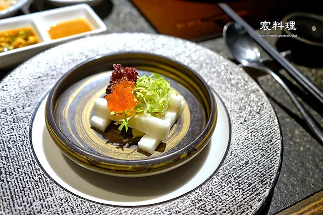 台北市信義區裡有一間隱藏版的日式創意無菜單料理餐廳,是好客餐飲集團旗下的「宸料理」,這裡提供了絕佳的隱私地點、高水準的餐點,用餐環境如同去到高級的私人招待所,有種特別的尊貴感,難怪備受政商界人士的喜愛,也是招待貴賓的好地方。今天蛋寶要來和大家分享在「宸料理」的特別用餐經驗,快跟著我一起來體驗!! 「宸料理」位於台北市基隆路一段159號B1,捷運市政府站1號出口,走路2分鐘內可抵達,雖然地點較隱密,但只要照著門牌號進入到大樓的B1,就會看到「宸」的招牌。(在好客燒烤-台北信義店的隔壁棟大樓裡)這裡是採預約制的無菜單料理,食材都是當日進貨,新鮮無慮,以確保每位客人都能享受到最新鮮的美味與尊榮的服務。 推開大門進入店內,整體的環境寬敞,木色系的裝潢,沒有刻意誇大的裝飾,整體簡單大方典雅。 這裡原先就是集團老闆的私人招待所,2011年才改設為「宸料理」,提供當季新鮮高級食材,並熟記每位客人的喜好,給予最貼心的服務,將每位客人都當作自已人,款待每一位重要的貴賓。 入口處有一隻木雕大水牛。 店內中間的水池襯托蘭花的優雅,很有情調。 左側包廂前,有著超大的酒櫃,擺放著多款的日本酒與洋酒。 吧台區前方約有8個座位,坐在這裡可和師傅們近距離接觸! 二位師傅們認真準備餐點的模樣,已讓我們迫不及待地想享受美食。晚間套餐的價位分別有1850元、2680元可選擇(服務費另計),若有特別的預算或其它的需求,可在預約用餐時告知,我們今日品嚐的是1850元套餐的新菜色。 ▼冷盤【醬燒透抽】吃起來韌勁十足,醬汁有淡淡的三杯味道,適合下酒的小菜。【醃紅蘿蔔球】梅汁風味的圓滾滾紅蘿蔔球,吃起來清爽脆口,非常開胃。 雖然餐點事先安排好了,但飲品可現場選擇!我們點了「可爾必思」和「葡萄汽水」來搭配今日的餐點。這裡的服務人員會隨時注意客人的用餐狀態,沒有過多的等待,前菜和飲品就送上桌了! 【鮑魚野菜沙拉】這道沙鮑魚野菜沙拉,擺盤美的讓人不忍下筷,宴客餐桌上的高檔食材鮑魚,搭配多樣新鮮蔬食,二者的結合就彷彿是海陸大享宴淋上和風醬汁的蔬菜沙拉,吃起來健康、清爽無負擔。 大塊的鮑魚,味道濃郁悠長,口感滑嫩彈牙,一口吃下,有滿滿的幸福感。 【季節上品生魚片】擺盤精美的生魚片,擺上不同的食用花裝飾搭配,送上桌彷彿就像是件藝術品,生魚片都是採用當季的新鮮魚貨,保証讓食客能吃到季節性的美味!我們今天品嚐的生魚片有迦納魚、金目鯛、青魽、鮭魚、鮪魚、干貝,服務人員建議我們從清淡的白肉魚開始品嚐最為合適。 ▼將食用級小橘花和紫蘇花穗放入醬油裡,瞬間有浪漫的fu,沒想到醬油也能有高顏值! 店家特調的醬油,有甘醇的甜味,完全不死鹹,加了食用花後還多了點花香味, 只要沾一點點,就能讓生魚片的風味非常豐富! 金目鯛上的深紅色小花是「紅芽」,搭配生魚片吃起來有花香及微辣的口感,超獨特!! 紋理細膩的鮭魚,沾點醬油放入嘴中細細咀嚼,新鮮軟嫩油脂瞬間融化,超喜歡! 綠色的海葡萄脆脆的,有一種特別的香氣,咬開後鹹味釋出,像被大海包圍的感覺。軟嫩鮮甜的干貝,加點清爽的檸檬片,超合拍! 油亮的新鮮鮪魚包覆紫蘇葉,一口吃下,味道非常有層次,柔軟的鮪魚,搭上紫蘇特有的香氣,滋味令人難忘!小提醒,紫蘇鮪魚生魚片的味道較濃郁,建議最後再吃,較不會影響口感。 【鮮蝦明治蒸】這是一道極具特色的創意煮物料理,只看到菜名時,會讓人好奇猜測它的樣貌,送上桌時,新鮮肥美的蝦子和蟹肉棒,放在像白色的三明治上,原來這就是鮮蝦明治蒸!! 上層的蝦子和蟹肉棒都很鮮甜,但我覺得更特別的是下層的明治蒸,吃起來有山藥的綿密香軟,中間還夾著火腿的鹹香,再搭配最底下的勾芡湯汁,口感更綿密滑順,細細品嚐,整個美味在舌尖上游走,hen讚! 【焗烤波龍起司】佔滿盤子的焗烤波龍起司看起來非常霸氣,一送上桌,焗烤起司的濃郁香氣四溢,光聞到口水就快流出來了。 這半邊的龍蝦相當大隻,龍蝦的鉗子已經跟我的手差不多大,滿滿的龍蝦肉包覆在裡頭,光看就覺得爽翻天!! 大口挖出龍蝦肉,肉質新鮮Q彈緊實,龍蝦的鮮美與起司相互交織的美味,讓我的胃暖暖的也好滿足! 【日本正宗朴葉味噌黑毛豬】朴葉味噌,是日本岐阜縣北部飛驒高山地區的鄉土料理,主要是將味噌、調味品、野菜混合在一起,放在朴葉上烘焙。這是道暖呼呼又兼具色、香、味的燒物料理。 店家使用的是鹿兒島的黑毛豬肉,在燈光下,微粉紅的黑毛豬肉看特別誘人,微火慢燒著朴葉,散發出獨特的香氣,黑毛豬肉混合著濃稠的味噌醬汁,吃起來微微的Q彈,鹹香中還帶點肉的甜味。搭配著香菇、蘆筍…野菜食用,這美妙的滋味會讓人將料理一掃而空。 【創意散壽司】醋飯上,已放好放滿了鮭魚卵和鮪魚,再搭配清爽的小黃瓜、蘆筍,整體顏色繽紛,彷彿要迎接清新的春天。 舀一口放入嘴中,鮭魚卵在嘴中爆開,微微的鹹味釋出,再搭配鮮嫩的鮪魚與醋飯,整體口感吃起來層次豐富又清爽。 【鮮魚石狩味噌湯】石狩鍋為冬季北海道的鄉土料理,是以味噌湯底加入新鮮鮭魚烹煮而成。這碗熱呼呼的鮮魚石狩味噌湯,裡面有著滿滿的鮮美鮭魚,冷冷的天氣喝上一碗,幸福滿分~極為過癮。 【甜點、水果】柳橙微酸甜、哈密瓜超香甜,再來個軟滑的焦糖布丁甜點,也為這一餐劃下完美的ending。 ~~蛋寶543~~ 「宸料