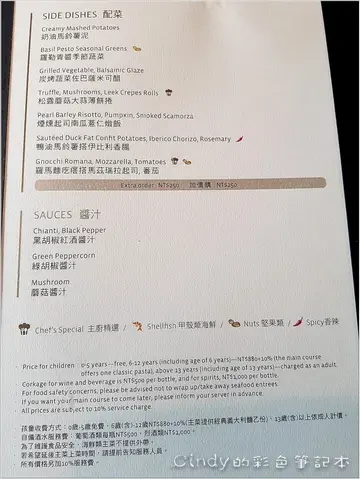 20190830如果現在叫我推薦信義區高檔牛排我腦海裡出現的第一名絕對是寒舍艾麗6樓的La Farfalla義大利餐廳   寒舍艾麗的義大利餐廳是semi buffet的形式點一個主餐  選擇湯品  配菜後 可以有自助bar形式的各類前菜 甜點  沙拉  水果等等  重點重點   是這個自助bar也太強大了有包括冷盤海鮮  反式火腿等冷肉  起司盤  還有開胃小點  pizza甜點  水果和冰淇淋等等先跟服務人員點好想要的主餐  湯品  配菜  還有飯後飲料之後 就可以去自助吧來取用美味餐點了餐廳也會先上不同的餐前麵包   現烤出來溫溫熱熱的 不過因為好吃的東西太多了  麵包就少吃一點吧湯品的部分我今天點的南瓜濃湯  超級甜而且濃綢的一喝就有驚艷的感覺接下來來看看自助bar的菜色囉 這一區是生菜沙拉的部分   各種不同的新鮮生菜和水果   配色好漂亮 食材也很高級也可以取用已經扮好的生菜沙拉   還有不同的配料  可以隨個人喜好添加 另外還有一些義式開胃小點  還有各類不同的冷前菜自助bar也會有三種不同的披薩 或者是焗烤麵不敢吃太多  因為等一下還有更美味的主餐 這個餐廳我最推薦的就是他們的牛排   其中我又覺得牛小排比老饕牛更好一點但每個人喜好的口味不同  大家還是可以以自己最喜好的部位來選擇不過我真的覺得牛小排真的超級軟嫩  好吃又juicy  [美國特選安格斯老饕牛排8oz  1990元]友人聽到我大推牛排   大家都選了牛排  哈老饕牛排我有吃過  也是很推薦   [玉米筍搭義式辣味豬肉醬] 配菜的部分也不馬虎簡簡單單的玉米筍  扮上主廚特製的義式辣肉醬之後  整個變成重口味的料理   超級推薦吃到肚子快翻天了   再來看看甜點吧自助bar的甜點精緻也多樣化 我覺得非常夠我選擇了很多朋友會以甜點的多樣性來判斷自助餐廳的好壞可是我覺得甜點也不可能真的吃太多夠吃  好吃   最重要 寒舍艾莉的甜點部分都非常的精緻  這樣子的甜點覺得吃了一兩個  就非常滿足了啊 ㄟ  不好意思  我本人最近生日   餐廳也幫我送上了一個濃郁的布朗尼蛋糕  我的第二頓生日餐   謝謝啦~~~~飯後的   espresso  杯子也太美了吧  好奔放喔水果的部分也是非常新鮮好吃 另外在甜點時間的時候   也會有服務人員特別推來提拉米蘇的車到桌邊喜歡提拉米蘇的也可以請服務人員現做一個喔    我很喜歡寒舍艾麗6樓的La Farfalla餐廳 我更推薦大家可以選擇平日的中午來用餐平日中午感覺真的非常的悠閑  氣氛也很舒服   我自己有假日來過   人就稍微多了一點   用餐品質就沒這麼好 附上菜單給大家參考一下   如果在信義區想挑一個比較有品質的高檔牛排當然還有一些很有名的選擇 譬如教父牛排 可是如果想要有一個不需要這麼正式   略為輕鬆牛排本身也非常好吃的餐廳   我很推薦La Farfalla喔   寒舍艾麗 La Farfalla義式餐廳台北市信義區松高路18號6樓02-6631-8000查看更多