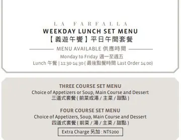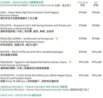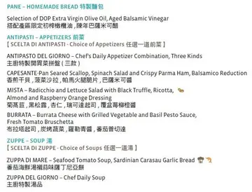 今年成了La Farfalla的忠實顧客現在!!! 他們家推出了平日的午餐這一定要介紹給大家~因為實在太!! 超!! 值!!看到菜單跟價格時我的眼球都要掉出來~~五星飯店開出這價格真的太有誠意了!!!💕貼心提醒💕 📍酒水無折扣 📍每組訂位以10(含)人為限,並加收原價10%服務費 📍不適用日期:2020/1/24-1/29、2/14晚間時段。   上次爸拔沒跟到~這次終於沒錯過!!!     我們4個人更是享盡了MENU裡各樣前菜與主餐~   這篇內容很豐富哦~~請大家細細品嚐!! 這天有點下雨   但是自然的光線透進還是覺得很舒服這是中午用餐的一種明亮的氣氛大本是一般MENU小本的是平日中餐的限定MENU平日午間套餐MENU (780元起)我們今天是享用四道式套餐前菜、湯、主餐、甜點車、咖啡或茶水資以瓶計價Santa Vittoria  汽泡水  220元/瓶evian 礦泉水   250元/瓶也可以點溫開水  則不另外收費非常欣賞他們對餐前麵包所使用橄欖油的用心提供是難得一見的桌邊服務酸裸麥麵包外皮跟底層都非常的脆  中間十分的柔軟   好吃的立馬再續一份 好多沾醬可以試   光吃個餐前麵包就那麼豐富香煎干貝, 菠菜沙拉, 帕馬火腿脆片, 巴薩米可醬 北海道的干貝   一次給上2顆  底盤抹上南瓜泥  豐富的新鮮綠捲鬚、菠菜葉淋上主廚特製龍蝦高湯醬汁及巴薩米可醬收尾最後風乾帕馬火腿脆片、風乾甜菜根脆片加以點綴清爽不油膩的滋味非常開胃大顆又鮮美的干貝   一次能享用二顆還真是令人滿足菊萵苣, 黑松露, 杏仁, 瑞可達起司, 覆盆莓柳橙醬 義大利一道很經典又傳統的沙拉使用了大量的新鮮生菜  醬汁也是清爽酸甜的覆盆莓柳橙醬柔軟清香的瑞可達起司搭上柳橙  吃起來格外清爽宜人松露醬、新鮮黑松露、杏仁片做為畫龍點睛豐富的沙拉佐以松露   一下變得不平凡布拉塔起司, 炭烤蔬菜, 羅勒青醬, 番茄普切達底下的麵包是烤得酥脆的普切達放上主廚嚴選「慢慢弄乳酪坊」製作的布拉塔起司淋上了羅勒醬  再搭配多彩的烤蔬菜、芝麻葉與紅藜麥是一道簡單又健康營養的開胃沙拉布拉塔起司我第一次吃到  看起來好像顆水波蛋與底下切成丁的蕃茄  還有脆脆的普切達麵包那既清爽又柔軟的口感  真是令人驚艷主廚特製開胃拼盤 (三款)如果想嚐點都不太一樣的東西   可以選這道主廚特製雖然每次也許都會有些不同   但就光我們這盤  完全不令人失望   還有一種各方面滿足的感覺自清鮭魚蘆筍派  比煙燻鮭魚再淡雅一點的滋味火腿烤蔬菜  有二款不同的火腿義大利炸海鮮   一尾去殼的鮮蝦底下還有幾塊炸小捲番茄海鮮湯襯蒜味薩丁尼亞餅使用魚骨、洋蔥、西芹、紅蘿蔔、月桂葉炒過燉煮約40分鐘後過濾出的魚高湯難怪喝起來沒有過酸又強烈的蕃茄味   反而是是道清爽入口溫潤的海鮮湯附上的薩丁尼亞餅又薄又脆  帶著蒜香  沾湯或直接吃都很不錯主廚特製湯品今天是我最愛的松露南瓜濃湯 裡面還有菠菜義式麵疙瘩松露的香氣與味道來自上面淋的白松露油裡點黑色一點一點的是橄欖與蝦夷蔥碾碎後去炸出來的小配角軟中帶著Q感的菠菜義式麵疙瘩  好多顆~怎麼辦  我都快吃飽了~~佩科里諾羊乳酪燉鴨醬手工百合麵    單點NT$580  套餐NT$780使用杜蘭小麥粉加上全蛋黃手工製成的百合麵因麵體摺紋較多適合搭配濃稠奶油醬汁或以肉為基底較為濃郁的醬汁燉鴨醬厲害之處是~~他明明是鴨~但口感跟味道上很像牛肉主廚選用烘烤過的鴨骨、蔬菜一同熬製再與去皮鴨肉、番茄和紅酒一同燉煮鴨肉口感分明不柴又軟嫩加入義大利最古老的佩克里諾(Pecorino)起司   濃郁又不搶戲的滋味  讓人一吃想再吃  不會有膩口的感覺百合麵好漂亮   真的像一朵朵的小百合花辦爐烤美國春雞(半隻), 馬鈴薯, 蘑菇, 檸檬, 鼠尾草   單點NT$680  套餐NT$880義大利料理的精髓在於原味所以他們為了保留春雞原味只用了胡椒、迷迭香、橄欖油等簡單調味醃製分為兩段式先將外皮烤至金黃,再將內裡烤至軟嫩底層襯以胡椒及巴西里碎青炒過的洋蔥、培根、蘑菇及馬鈴薯馬鈴薯入味又綿密是本道料理的另一個小亮點像我們四人想分食服務人員直接桌邊幫我們分成四份後一一分放入我們盤中我之前很不愛春雞   因我總覺得乾柴他們家真是我吃到現在又嫩又多汁的春雞美味好吃   皮帶點微脆   可惜春雞都小小的   四個人一分   我覺得2口就吃完了~好吃到覺得我一人也可以吃掉半隻啊!! 哈哈煎烤季節鮮魚, 焗鑲淡菜, 煙花女醬汁     單點NT$680   套餐NT$980對於愛吃魚肉的我來說   我通常會注意MENU上的魚料理左右二顆淡菜用普羅旺斯道地作法新鮮吐製成麵包粉再加入鯷魚、橄欖、巴西里碎、橄欖油、起司粉一同快炒舖於新鮮淡菜上面再進行烘烤.今日的現流魚是小石斑   肉質彈牙鮮美   光想都流口水魚皮美美的依附在魚肉上  呈現完美的脆度佐以微辣的煙花女醬汁  以及蒜味馬鈴薯泥   增添魚肉的風味今天這套餐每人吃的很滿足   我們全家一至向大家推薦~對照他的價位實在是物有所值CP值極高然後!!快來利用我!!!用餐時不要忘了拿出手機證明你是Cindy的FB粉絲!!免費讓你三道菜升級四道菜不用在前菜跟湯之間要選哪個好掙扎~~~  通通免費升級~ ~ 通通吃得到~~查看更多