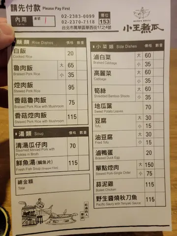 小王煮瓜存在手頭情報已久,久到原來抄得的店名是「小王清湯瓜仔肉」,都改名四年還得了必比登,這才有緣一訪。 平日上午約十一點抵達,已是客潮洶湧,幸好勉強在牆邊找到位置。內用記得先拿單後找定座位,畫好單再到櫃檯結帳,可用載具和linepay挺方便。以下皆為小份價格魯肉飯 35元 清湯瓜仔肉 70元 魯肉飯滷汁色澤很深,滋味較甜。肉燥用的是肥肉丁,化口無膩有入味。 湯頭醬瓜味不重,整體清爽,但湯裡的醬瓜鹹味明顯,感覺很像醬瓜味沒有完全融入湯頭(跟以前喝到的瓜仔雞湯比起來)。肉羹個人挺喜歡,魚漿比例不會太高,後腿肉的嚼勁和肉香不錯。滷白菜 35元 豆腐 15元 滷鴨蛋 20元 焢肉 75元 滷白菜因澆淋滷汁而變得厚重又油,與己好有別。 豆腐、滷鴨蛋和焢肉很奇妙的都沒入味,僅是表面著色。豆腐軟嫩有水分;鴨蛋蛋香濃郁;焢肉肥肉彈而帶油感,瘦肉略柴。 一路吃來,魯肉飯和肉羹較合喜好,其它滷製品意外不突出。這天若非時間有限,很想把源芳刈包和阿義滷肉飯一起訪完。也幸好時間有限,否則體重又要失控了。…查看更多