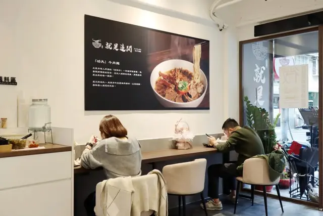 位於松山區的「就是這間-功夫牛肉麵」,以蔬果熬煮湯頭,搭配上大塊軟嫩牛肉,入口便能感受到結合後的香氣,無論是清燉或是紅燒都讓人回味無窮,是間餐點及環境都優質的餐廳。餐廳位置及環境「就是這間」鄰近捷運南京復興站,從5號出口步行過來約10分鐘的路程,附近有不少美食,現在又多了一間值得品嚐的餐廳了。餐廳剛開幕沒多久,所以環境還相當新穎,最棒的是整體空間寬敝舒適,和傳統牛肉麵店很不同,光這點就讓我想再回訪了。餐廳以白色為基底帶出餐廳的特色,半開放式的廚房,不僅沒有油煙味,還相當乾淨。長廊的視覺感還不錯,坐在這用餐還可以看見廚師料理呢。MENU及餐點分享架上的醬料、餐具及開水皆可以自行取用。酸菜是牛肉麵不可或缺的配角辣椒很香,帶點後勁。這邊的牛肉麵除了常見的牛三寶,還有和別人不一樣的現煎牛雪花,香噴噴的牛雪花搭配起來也滿對味的唷。菜單MENU牛肉麵有分清燉、紅燒、乾拌三種,如不吃牛肉也有雞肉麵可選擇,一樣是都是採用蔬果熬煮的湯頭,另外還有湯類及小菜類可以搭配。功夫牛肉麵 / 紅燒 / 中碗功夫牛肉麵可以同時品嚐四個部位,有牛腱心、牛前筋、牛肚、牛雪花,份量大、肉也夠多,即使中碗還是超級飽,相當過癮,這碗必嚐。瞧瞧這牛腱心,超有厚度,而且燉得相當軟嫩,每口都能感受到肉香味,超迷人的啊。牛筋軟Q,不失口感,讓人愛不釋口。蜂巢牛肚帶點嚼勁,在口中愈嚼愈香。牛雪花為油花較多的牛胸腹,煎後油香味十足,送上來時帶點紅潤,放在湯裡意外的搭。這邊的麵條選用的是微粗的拉麵,即使在湯裡泡了一回還是相當Q彈,口感超好,我喜歡。蔬果熬煮的紅燒湯,帶點甘甜,一點也不會鹹膩,這湯頭我可以喝光光。半筋半肉牛肉麵 / 清燉 / 中碗牛腱心肉和牛前筋口感相當好,所以清燉這碗我們決定選擇半筋半肉,可以享受大口吃肉和牛筋的滿足感。雖然紅燒不鹹膩,但清燉的湯頭更加清爽,我也相當喜歡。肉塊和牛筋一樣大塊豪氣,超能滿足味蕾。川味雙椒牛雪花拌麵拌麵除了麵條和肉,也會附上些許的蔬菜,讓整體的口感更豐富。雖然牛雪花加入湯裡也滿對味的,但我覺得搭配拌麵更加分,因為油花和麵條結合後,香氣更能鎖住。吸飽油花的麵條超好吃,很喜歡這個組合。麵條雖然已經帶點辣度了,但我覺得再加上些許的辣椒更出色,愛吃辣的朋友一定要加起來。筋肉肚拼盤滷味所選的部位和厚度,與湯麵不太一樣,吃起來較有嚼勁,感覺好適合當下酒菜喔,切一盤回家加菜也不錯。單吃的話會覺得味道略淡,但沾上主廚特調的醬料後提味不少呢。紅燒滷花干花干吸飽了湯汁,咬下後還會噴汁呢,本身的辣度不明顯,建議可以再加點辣。柚香紫蘇蘿蔔在大口吃肉之後,就是要來些清爽的小菜,柚子及紫蘇調味後的蘿蔔,酸甜可口。燙青菜青菜以海鹽調味,清爽不油膩,和牛肉麵搭配很剛好。「就是這間」的清爽香醇湯頭,以及大塊豪氣的牛肉,都讓我回味無窮,是一間會讓我想再回訪的牛肉麵店,推薦給大家。…查看更多