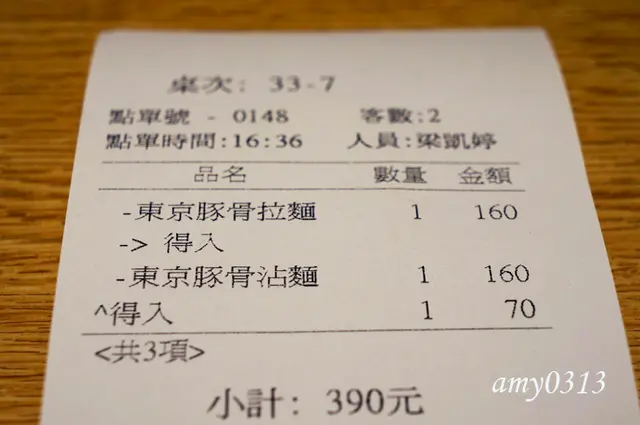 屯京拉麵(02)2731-789711:00~23:00(最後點餐至22:30) 用餐日期:2015/03/23 這間位於台北的屯京拉麵,是許多部落客大推的拉麵店,甚至假日來,都會遇到大排長龍的景象,但檸檬這次來,是平日時間,剛好這天又遇到下雨天,所以遇到所謂的排隊人潮但附近停車位真的很不好找,大概繞了快半個小時,才找到附近的一間收費停車,唉!!每次來台北,最困擾的就是找停車問題,難怪台北人都不愛開車,寧可搭捷運出門進門前,服務人員還很貼心的出來,幫我們雨傘套上了傘套~店內裝潢風格很簡約,牆面以白色系為主,用餐環境也很乾淨,二樓部分也有用餐座位,只是二樓用餐環境中有很濃郁的芳香劑味道,可能因為廁所在二樓,所以打掃有特別噴了芳香劑,但檸檬不愛在濃郁的芳香劑味道中用餐,還好我們坐的位置是在一樓 屯京拉麵以豚骨,味噌,魚豚豚骨.麻辣,這四種為主要另外還有沾麵.鐵板.拌飯.以及小菜可選擇ps.拉麵在店餐時,可免費加麵,但檸檬沒有另外特別再加麵,就已經居覺得份量很足夠了跟許多拉麵店一樣,筷子放在一旁的小抽屜裡自製辣油的味道,跟麻辣豚骨拉麵的麻辣味相同,帶有點苦味的辣油,辣度約是小辣程度,香氣並不是很明顯另外醬料中,最讓我感到特別的,是那瓶黑豆醋,黑豆醋的味道並沒有一般白醋味道這麼強烈,味道還滿順口,帶有一點甘甜,檸檬還滿愛黑豆醋的味道小魚涼拌豆腐 $60炸得非常酥的小魚,加上蔥花以及柴魚,舖滿整個豆腐上,在淋上和風醬汁但只可惜和風醬汁的味道略顯不足,檸檬又另外加上一旁的黑豆醋,感覺味道挺搭的,所以如果有點這道小菜,可試試看與黑豆醋搭配的風味魚豚叉燒拉麵 $280一上來,這畫面簡直讓檸檬傻眼,這叉燒份量未免也太多了吧?!但湯頭部分,油膩感超重,讓檸檬無法將整碗湯喝完,魚豚的味道,檸檬整個大打槍,不愛第一次吃拉麵,讓檸檬和老公,都無法將湯頭喝完拉麵麵條部分,像似泡麵的捲麵,但口感比泡麵Q彈雞蛋的部分已經到了8分熟的地步,不是屬於檸檬愛的半熟蛋,好失望喔!!叉燒口感也是普普,檸檬只吃了一塊吃後,剩下就給老公吃了麻辣京蔥拉麵 $260湯頭部分,一樣油膩感很重,麻辣湯頭帶苦味,辣度屬於小辣,香氣表現也普普只收餐點費用,並沒有另外加收服務費 環境整潔,服務好,但湯頭部份油膩感很重,檸檬不是很愛,應該不會再讓檸檬來第二次 以上內容純屬個人食後心得,僅供參考…查看更多