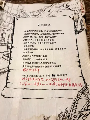 在花家食堂排隊的時候,就看到這家開在花家隔壁的DOUSUN COFFEE,越看越有FU。吃完花家之後,因為波妞爸的咖啡蟲還沒被餵飽,所以雖然肚子很撐,但還是來這邊滿足一下波妞爸的咖啡癮。因為沒有查資料,那時心裡還在納悶為什麼要叫左咖啡呢?原來據說老闆是左撇子,"左(台語)先生(日文)"所以就是DOUSUN的由來啦~除了咖啡之外,還有輕食跟手工蛋糕,但是沒有賣餐唷~所以可以去隔壁花家用完餐後再來這邊吃下午茶XD中午12點半,店內卻早已快座無虛席,好多人都是帶著筆電來這邊工作的樣子,所以咱們聒噪的壞波妞應該是打擾他們工作的噪音吧,冏。因為帶小孩,本來想要坐這一桌,可惜有人訂位了。這家咖啡店真的挺安靜的,好像不太適合帶小孩來打擾人家。後面是甜點櫃,網路上查的資料大家都說雖然是咖啡店。但甜點一點都不遜色,要不是肚子還很撐,我一定要點一塊蛋糕來吃看看,看來只好下次有機會啦~咖啡豆跟咖啡器具造景。我們座位就在這個旁邊,超怕壞波妞把人家東西弄壞弄破的(汗)咖啡店一定要提供的WIFI,這裡當然也有~特別的是這裡還可以提供筆電插電,雖然假日時一次要20元,但我想應該不會有人在乎這個小錢吧XD店內有低消,一個人110,既然要低消,那就連壞波妞的一起點吧~這是要給壞波妞吃的手工布丁(內用$45,外帶$55),果然如大家所說,甜點真的也很好吃,壞波妞剛吃完午餐也還是一個人把這個布丁吃光光了!不喝咖啡的波妞媽點的水果茶,好喝,有一些店的水果茶會有一種不自然的味道,但這裡完全不會唷~只愛喝拿鐵的波妞爸點的拿鐵,很大一杯唷~波妞爸剛吃完花家很撐,這杯咖啡差點喝不完XD波妞爸說左咖啡的咖啡豆烘焙比較久,後座力很強,咖啡很濃郁。那兩杯小杯的是店家招待的忘了名字的咖啡><,店家除了賣咖啡,也有咖啡豆,所以如果喝了喜歡,還可以買咖啡豆回家唷~雖然錯過了有名的樂樂,但這裡讓我覺得更棒喔。老闆很貼心印象深刻;那天結帳的時候,手抓了一把零錢要結尾數,但因另隻手拿東西了只好把抓一把零錢的那隻手打開請老闆拿一下,結果老闆就說要幫我收走那些一塊錢的! 其實很多店家,如果自己的商品沒有零頭,不是很願意收這種1元的,而老闆主動要收讓人覺得揪感心,尤其…還少一塊錢…老闆應該很醉心於咖啡,到那邊不懂的話問老闆,會有很詳細的解說與建議,當然也適合點個咖啡在那裡放空上網看書啦…營業時間週一: 11:30 - 1:00週三 - 週五: 11:30 - 1:00週六 - 週日: 10:30 - 1:00電話:02-27602992地址:台北市延壽街139號
