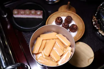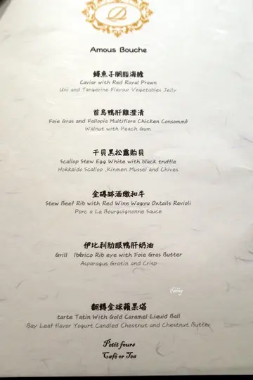 德朗餐廳 De Loin位於內湖,是由維多利亞建設公司所經營的頂級法式餐廳。成立多年來,以頂級的食材呈現精緻的法式料理,高雅尊貴的用餐環境及週到的管家服務,取得許多饕客的認同,也取得台北米其林餐盤美食的肯定。主廚陳宣達(Gordon Chen)曾任職香港米其林三星餐廳,廚藝精湛創意十足,令人在德朗餐廳 De Loin用餐是一次驚豔,無限回味!德朗餐廳 De Loin位於內湖昇恆昌免稅店對面,座落豪宅的一樓,相當低調的門面,保留著些許的神秘感。德朗餐廳 De Loin原本是維多利亞建設公司的私人招待所,對外營業後仍採預約制。跟著艾方妮一起去探究德朗餐廳 De Loin的美好吧!De Loin一詞在法文是遠道而來之意,意喻上選食材與精湛,讓人"不遠千里,回味無窮,一來再來"。在櫃檯即有服務人員帶領至接待區等候,有著奢華中帶出的舒適感。主廚-陳宣達(Gordon Chen)陳宣達主廚於14歲就開始接觸料理,做菜是他生命中最美好的事。曾任職於香港 L’ATELTER de Joel Robuchon 米其林三星餐廳,2011年至里昂皇家酒店管理學院-保羅.博古斯 Paul Bocuse 學習並精進廚藝。曾任職美國希爾頓五星級飯店、台北亞都麗緻飯店,並榮獲香港西餐國際比賽銀牌。佔地寬闊的德朗餐廳 De Loin,卻只安排了60個座位。利用舒服的沙發取代餐桌椅,營造尊貴不受打擾的用餐空間。每張桌上的燭台及使用的餐具,都是採用知名的銀製品牌-Georg Jensen。說真的,這樣的角落求婚肯定會成功啊!連口布都繡上自家的LOGO,從大至裝潢設計,小至杯盤餐具,都可以發現德朗餐廳 De Loin在細節上很用心。還有從一進門到坐到座位上,服務人員合宜且貼心的舉動,都令人倍感尊榮。這是當天我們享用的是事先預約的德朗饗宴,這菜單是放在餐桌上的信封裡,令人對於接下來的餐點帶著慎重的期待心情。精美的水杯中倒入氣泡水,並放置了檸檬片。手作麵包這本來是烤熱一個後食用完再續烤另一個才上桌,配合我們拍照,於是三個麵包一起上桌。事後服務人員還貼心詢問是否要加熱。正常狀況會先上左下角的法國麵包,接著是右下角的蜂蜜蔓越莓,最後才是上方的紅茶麵包,另外會附上進口的奶油供塗抹。手作麵包具麵粉香氣且嚼感極佳,令人相當喜愛!開胃小品銀芽透抽襯帕馬森起司搭配透抽脆餅佐青醬外表有如餅乾的其實是透抽,中間夾入了燙銀芽、透抽、軟絲,最後飛揚其外的是帕瑪森起司,中間是沾食的特製青醬。一咬下後透抽脆餅的口感很驚喜,而整體滿是海鮮的鮮味,青醬的提點更顯清爽。開胃小品法式肉糜襯甜菜根玫瑰搭配布里歐麵包外型細緻美麗的玫瑰花是由甜菜根捲成,內夾入了豬肉泥及紅酒凍製成的法式肉糜,以布里歐麵包為底,再舖以紅酒漬紫高麗菜。法式肉糜豐富了甜菜根的味道,紫高麗菜則提供了脆口感,布里歐麵包的香甜化在口中令人回味。前菜鱘魚子胭脂海膽Caviar with Red Royal Prawn採用美國海膽,其上飾以鱘魚子醬,其下有甜美胭脂蝦肉,並襯以蔬菜高湯燉煮的柑橘果凍,柑橘果凍的微酸甜,令濃郁的海味多了清爽感。湯品何首烏鴨肝雞澄清 Foie Gras and Fallopia Multiflora Chicken Consommé這個酥皮濃湯就是來自於Paul Bocuse的發明喔!只是每個人見到的第一個想法是:這是國王派嗎?不不不,這依然是酥皮喔!只是主廚花了巧思在酥皮上劃上幾刀,就顯示出如同貝蕾帽的酥皮蓋子。德朗餐廳 De Loin的服務人員全程都戴著手套進行桌邊服務,每樣餐點的食材及做法都相當熟悉,說菜根本難不倒他們,非常地專業。西式的酥皮配的不是玉米濃湯,而是中式的何首烏。以老母雞、雞腳、蔬菜等燉了13小時的雞湯,最後去蕪存菁的黃金雞湯,這也是德朗火鍋所用的湯底。而這天我們喝到的是以澄清雞湯再加入了桂丁雞、鴨肝、桃膠、打發蛋白、雞肉肉泥、蔬菜泥再煮了5個小時而成。這經歷中式與法式手法的湯底,喝來甘醇不油膩,滋味豐富。以切成小塊的酥皮麵包沾著食用,別有風味。干貝黑松露貽貝Scallop Stew Egg White with black truffle以北海道干貝加上法國淡菜,其上刨上了不少的黑松露,其下襯的是台灣珠蔥泥。而這麼鮮美的海鮮,入口傳來的柔嫩感,是蒸蛋白液。滑嫩細緻充滿海鮮的鮮甜,還有黑松露的香氣,這道料理細膩的手法,真令人喜愛!Rolf Binder Halliwell Shiraz Grenache羅夫賓德酒莊 海利威而 希哈/格納希 精釀紅酒(澳洲)準備上肉品前先來杯紅酒吧!這瓶來自澳洲的紅酒,呈現深石榴紫色,入口酒體中厚,鮮嫩多汁富含果香,單寧柔細宜人,酸度爽脆,餘韻持久。金磚缽酒燉和牛Stew Beef Rib with Red Wine Wagyu Oxtails Ravioli把舖著金箔的美國牛小排稍微移一下位置,就可以發現其下是一顆餃子,是採日本和牛尾與美國牛尾結合成內餡的餃子。牛尾充滿膠質與帶著Q勁的餃皮吃下相當有口感。搭配的是勃根地紅酒醬汁,並以麵包丁增加口感層次。這一款餃子既富創意又兼具美味。伊比利肋眼鴨肝奶油Grill Ibérico Rib eye with Foie Gras Butter採用伊比利豬肋眼,其上是風乾的羽衣甘藍碎末,及大量的烤黎麥,搭配的是鴨肝奶油及黑松露醬。瞧這伊比利豬依舊粉嫩的肉質,即便濃郁的醬汁也掩蓋不了伊比利豬肉特有的核果香氣,烤黎麥的脆口,也令伊比利豬更富層次口感。這天享用的德朗饗宴,主菜選擇伊比利肋眼鴨肝奶油$2800,另有以下兩種主餐的選項。鱘魚子龍膽Caviar with Bridle bass ($2600的主菜)炙烤紫菜香米日本和牛 Roast NORI with Taiwan WUFENG Fragrant Rice($3000的主菜)由