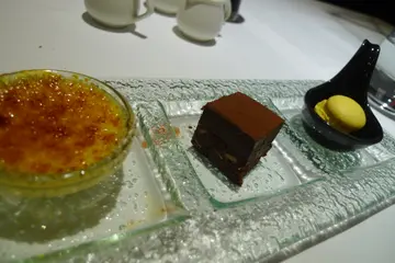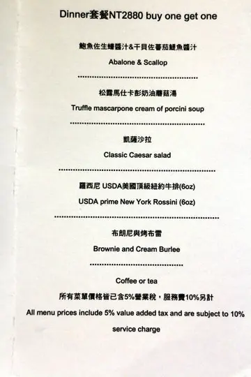 一進來就看見一個大冰箱,裡面放的都是高級的美牛,每塊的油花看了就想吃啊... 餐廳的空間相當靜謐優雅,地毯與純白燙得平整的檯布,在在都展現出專業感。燈飾也很有設計感,簡潔又帶有藝術風格。==以下是這一季推出的優惠套餐菜單== 看到每一份都有雙前菜跟雙甜點,阿偉眼睛一亮啊!也就是說即使是買一送一雙人份套餐,"每個人"都可吃到兩種前菜跟兩種甜點!不過要注意的是,需另附兩個人的10%服務費,也就是288x2=576所以這個雙人套餐加上服務費是2,880+576=3,456再除以2,平均下來一個人是NT$.1728 至於什麼是"羅西尼"牛排?傳統的羅西尼牛排美味方程式肥嫩的菲力牛排配上鵝肝帶著奶香的油脂一起入口!讓人驚豔於鮮美的肉汁調合於奶香的絕佳風味!主廚更是顛覆傳統將菲力改成熟成的紐約牛排,讓饕客們能享受熟成過後和菲力牛排不相上下的鮮嫩,但更加Q彈的口感,搭配鵝肝更是完美提昇整道菜層次,沒有一絲違合感!濕紙巾與餐巾紙,都印著Logo 首先上桌的是熱呼呼又香噴噴的麵包(每份4片,可無限續),如果我有兩個胃,肯定要再來一份的,因為實在太好吃了。 將奶油塗抹上去,才一下子就融化了。又軟又香還有一點筋度的口感,這餐前麵包已經表現出水準了! 這是菜單裡沒有寫上的隱藏版"前菜",是兩片炙燒過的黑鮪魚,上面擠上的是芥末美乃滋,就連平時不敢吃生魚片的我,都吃得到它的香與滑嫩。 雙前菜:(左)鮑魚佐生蠔醬汁、(右)干貝佐番茄鳀魚醬汁干貝上面還有一點點的魚子醬,增添一點鹹鮮風味。而干貝本身也經過炙燒,外香內軟,沾一點盤上味道稍濃重的鳀魚醬,有種多層次的海味。這鮑魚肉質十分彈Q,底部還墊有些豆泥,清爽有滋味。 松露馬仕卡彭奶油蘑菇湯這道湯品的松露味、奶油香與蘑菇香都比一般外面喝的濃厚。先喝一口原味,是溫潤的感覺。再請服務生加入黑胡椒,整個香氣與味蕾更加提升,香味變得更強烈! 接著上的凱撒沙拉,大概是我吃過給得起司味道最濃的了。雖然看起來上面的起司似乎不多,但實際真的夠濃,也稍微偏鹹,不過我還蠻愛的。 羅西尼 USDA美國頂級紐約牛排(6oz)用的是美國Prime牛肉,油脂甜度無話可說,頂端再放了一塊油亮的鵝肝,更是大加分。現今歐洲鵝肝產量越來越少,據說吃一塊就少一塊,成本也越來越高。在這塊鵝肝上面又放了些許魚子醬,也是頂級食材,業者幾乎沒在考量成本嘛? 鵝肝的表層煎過,帶點焦脆感,但仍看得出它飽滿的油脂。 厚度也頗有份量 牛排大約五分熟,是公認吃Prime美牛的最佳口感。看起來蠻生的,但實際上都有溫熱,吃進口中有濃濃的牛油香甜。再與鵝肝一起吃,簡直是人間美味啊!別看牛排只有6盎司,我與朋友都沒吃完,實在吃不下了。 甜點有兩種,(左)布朗尼、(右)烤布蕾 這塊布朗尼的堅果也太豐富了吧!而且香氣也夠,布朗尼帶著微苦不甜的口感,吃完不會膩。 這個小份的烤布蕾蛋香也好濃,表面的焦糖薄薄的很脆,整體也很好吃。 餐後的拿鐵咖啡有漂亮拉花,是這兒一位資深服務生的傑作,據說他會拉很多種花樣唷! 思泊客的夜晚又有另一種風情,想像著在夏夜裡可以坐在這裡喝點東西,聊天看101。你不相信可以看到101嗎?下圖就是證明... 是不是一整支的101盡收眼底了?以後也可以在這跨年看煙火吧?前提要訂得到位才行!查看更多