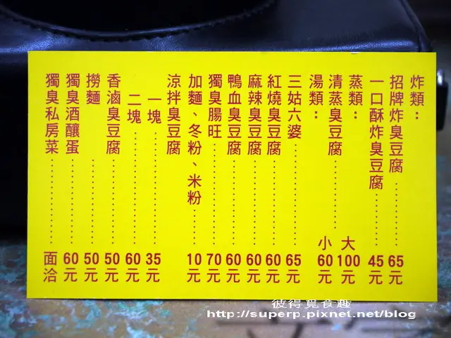 小時候都不懂欣賞臭豆腐,開始去台灣旅行逛夜市才開始吃,台式臭豆腐不似港式能飄香到幾個街口以外,吃起來也沒甚麼臭味,就跟一般炸豆腐差不多嘛,非常容易接受。而且身為一個不吃肉的人,在夜市已經沒甚麼選擇了,臭豆腐總像明燈一樣守護我的胃。台式臭豆腐除了用炸,也有用蒸的,吃火鍋時也可以丟進去。怕上火時可以選比較健康的烹調方式,可謂十分多元化,所以有專門賣臭豆腐的食店也不奇怪。這次我就拜訪了一家專業臭豆腐店,想要吃綠色的發霉豆腐。這𥚃的招牌菜分別是炸臭豆腐、蒸臭豆腐和涼拌臭豆腐。不知道該如何挑選,還可以參考豆腐的臭度等級,招牌油炸臭豆腐就有12級臭,涼拌有13級,還有最厲害的臭膏就15級。(2017年3月一訪)各種各項都想試試看,單點以外還有附白飯和湯的套餐呢!最後決定先試試招牌炸臭豆腐。霉炸豆腐泛著灰灰綠綠的顏色,上面灑上椒鹽,聞起來味道不算濃烈,吃起來也沒有很臭,就吃到那種發酵過的氣味。中間的豆腐好像預先用叉子壓爛過一樣,口感有趣。隨碟附的泡菜吃起來應該有加某種酸性果汁。另外加點的燙青菜,淋醬有沙薑雞醬汁的味道。既然12級臭的炸豆腐我也吃得這麼愉快,看來下次可以挑戰更厲害的等級喔。2017年3月攝(2018年3月二訪)事隔一年,怎麼我又來到這裡了?XD因為飯店在信義區,沒想到要吃甚麼就走路過來吃豆腐。為甚麼吃的又是炸豆腐呢?我本來想點蒸臭豆腐,然後店員阿姨說應該試涼拌和招牌炸豆腐,所以演變成這樣。看舊照片才發現炸豆腐的切法不同了,由四個長方形約成兩個正方形,吃起來脆皮的表面面積變小,味道倒沒大分別,一樣是「梅梅爛爛」(咦?XD)之前沒吃過的涼拌豆腐以一磚為點菜單位,豆腐表面鋪滿香香脆脆的調味,豆腐本身的「腐爛」程度好像比炸豆腐更甚,筷子一夾就像爛泥一樣,放進口還要刻服進食腐爛物的心理障礙 XD。不過臭豆腐這事物除了是台灣特色小食所以值得一試外,近年也流行吃發酵食物養生,臭豆腐就發酵得非常徹底,牆上掛的牌子也有寫著各種吃臭豆腐的好處。正所謂,吃得臭中臭,方為人上人之類吧。XD2018年3月攝價格招牌油炸臭豆腐 NT$65涼拌臭豆腐 NT$35/一磚 NT$60/兩磚燙青菜 NT$30…查看更多