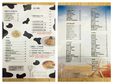 今天要來介紹位於國際街的手工廚房~~~小小一家店 看來是賣咖啡 餐點 茶~~~店內餐點可以外帶喔 還有優惠價^^ 營業時間接下來一系列照片~~~帶大家進入乳牛世界廚房櫃台:用乳牛花紋裝飾 再加上幾隻慵懶趴睡的乳牛不管是書報架還是廚房的外邊上都少不了乳牛的身影用餐區:黑白花紋一在表現各種被乳牛充滿的情境~~~店員看我大汗淋漓趕緊開冷氣 那我就挑這裡做下吧~~~超舒服 一旁的牆壁上還有店家手繪的乳牛 還會哞哞叫WWW菜單有分早午餐的 簡餐 飲料單早午餐:點早午餐都有附餐飲料(蠻多品項可選) 有輕食 義大利麵.... 飲料蠻多可選擇 價位都不貴最後我選了早午餐的A餐:烤起士培根水波蛋吐司配凱薩沙拉(110元)附餐飲料選黑糖奶茶(冰)餐具跟調味料 面紙 水自取^^ (蠻特別的是果糖用好像洗碗精的瓶子裝店內有WIFI 耶 既然乳牛坐我對面 當然幫他倒杯水好好聊一下啊~~~ 用啤酒杯裝著黑糖奶茶喝起來有淡淡黑糖味 只是味道對我來說只有微糖的程度所以我自己又加了果糖XDDD 這樣卡和我的甜度~~~ 烤起士培根水波蛋吐司配凱薩沙拉YA 先來給乳牛拍照~~~ 乳牛看到這麼豐盛的一餐好開心烤土司上面放了培根 再放上水波蛋跟融化起司 淋上柳橙優格醬咬一口~~ 吐司烤得不夠酥脆 但是Juicy溫熱的蛋黃配著柳橙優格醬以及濃稠起司 讓嘴裡充滿幸福滋味 底下的培根酥香好吃(培根最讚這柳橙優格醬實在加分 讓餐點吃起來酸甜不膩 讓人想再吃一片XD 凱薩沙拉沙拉的菜葉很新鮮 缺點是搭配的麵包丁吃起來冷冷的 應該要烤熱讓他搭配吃起來口感脆脆才好吃啊~~~ 然後凱薩沙拉醬蠻不錯吃只是有點少 但是味道爽口 覺得店家做的食物都蠻清爽很健康店內真的無處不乳牛 這個牌子應該猜得到是什麼吧?拿著捲筒衛生紙 努力半蹲 沒錯~~ 廁所是也來個感想做個Ending~~~手工廚房看菜單介紹時 就能知道店家餐點以手工現做自豪所以餐點都是要稍等(不過我也沒有等太久 大概20多分鐘)至於餐點口味還不錯 110元的價位吃到早午餐蠻划算的雖然我覺得可以再搭配個薯塊之類的 吃起來比較有飽足感而口味上 我覺得很是清爽健康 下次會想帶朋友一起吃不同的早午餐品項 而且店內裝潢充滿乳牛 真的很可愛(小朋友應該會很喜歡今天就介紹至此啦^^ 我們下回再見…查看更多