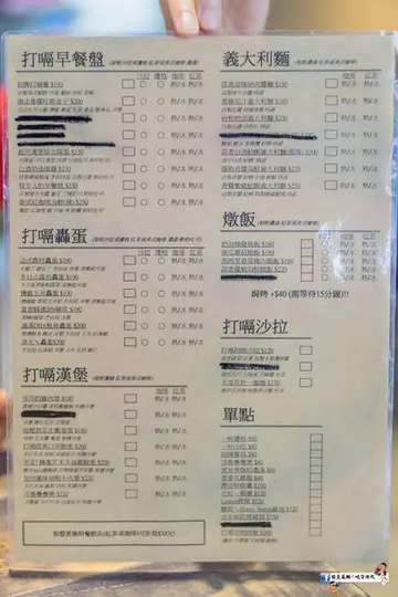 趁著週末沒事跟黃先生到IKEA採買,順道在附近找了間早午餐廳距離台鋁步行約15分鐘路程的"打嗝吧",有個充滿趣味且淺顯易懂的店名顧名思義就是希望客人吃完自家的餐點後可以滿足地打個大大的飽嗝門口小黑板上寫著"用餐請注意":每人低消150元、用餐限時90分鐘假日只接受4人以上訂位,如遇客滿請入內填寫候位表(還好我們有先訂位)店內用餐區不大,開放式廚房旁的文青小空間其實是貼著書櫃壁紙的洗手間因不另外加收服務費,餐具和茶水需自取,選好餐點後自行到櫃台點餐結帳菜單上有早午餐常見的早餐盤、轟蛋、漢堡,也有義大利麵和燉飯價格在$180-$280之間,餐點均附飲品(紅茶/美式咖啡),如欲更換可折抵30元鐵鍋香煎雞腿排(貪吃價$250)看起來營養均衡又豐盛除了主角雞腿排,還有嫩蛋、時蔬、鮮奶吐司、濃湯、沙拉/優格、飲品煎過的雞腿排不但外皮酥脆還多了股油煎的香氣,肉質軟嫩多汁但或許是因為沒先醃過,雞腿排吃起來稍嫌無味(也沒附醬料可以沾)與嫩蛋和其他食材放在一起,吃起來都是雞腿的油味.....我不愛!!濃湯味道有些偏淡,一旁的吐司倒是很合我胃口(我很少把附餐麵包嗑光光)鬆軟的鮮奶吐司抹上微甜帶點堅果口感的楓糖核桃抹醬,搭起來真對味猶豫不決的黃先生則選了加州風味培根牛肉堡(貪吃價$220)漢堡餐均附薯條、紅茶/美式咖啡,並貼心地備有免洗手套方便客人食用培根牛肉堡看起來頗有份量,一口咬下肉汁隨即從缺口噴了出來朋友點的早安!蜂蜜芥末卡滋雞腿堡(貪吃價$200)紅茶 & 咖啡拿鐵(貪吃價$90)[ yi言一語 ]餐點選擇多樣化且擺盤豐富,至於料理口味........稍嫌普普這份量對女孩兒來說可能吃得夠,但不足以讓黃先生吃完飽到打嗝查看更多