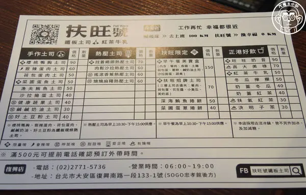 扶旺號鐵板土司 復興店 (台北) 網址: https://s.openrice.com/cHRSm02Xl0500 地址: 台北大安區復興南路一段133-1號 電話: +886 +886227715736