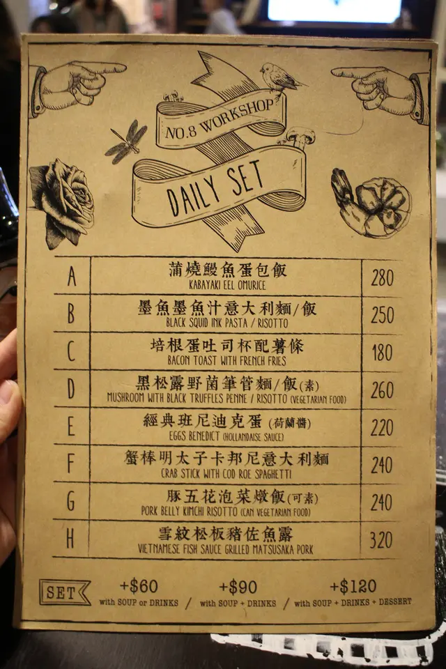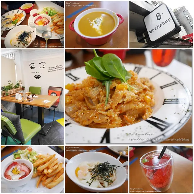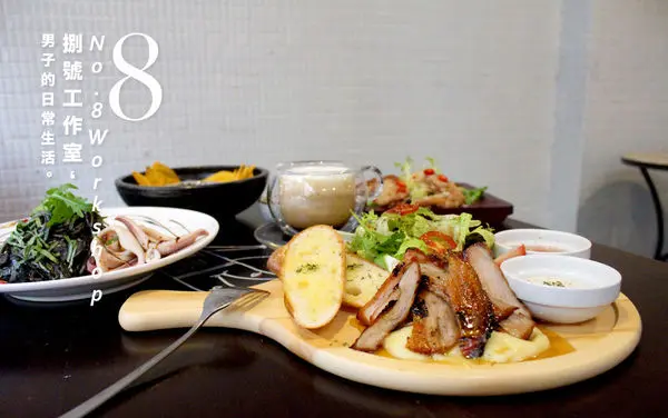 前陣子和朋友聚會不知道去哪邊,想到可以待比較晚又不限時的且東西又不錯吃大概就是No.8 Workshop 捌號工作室!第一次到達門口其實我有點傻眼內心是有些後悔的,大概就是因為看到他有一區吸菸區,類似茶街那樣我不大喜歡,但進去感受就不一樣了!進了大門還有一個室內的門,整體感覺像是走文創、復古混搭的風格裡頭擺設很多牆壁也是很豐富花俏,一樓的座位有限所以來這邊還是提早訂位比較好店內提供了些桌遊可以租借(如有需求請詢問店家)而遊樂器我就不清楚可不可以租借玩樂了此外還有販售復古的擺設、小物連廁所前也可以這麼花俏的擺設!吧檯旁的公仔擺設蜂蜜咖啡 (140元單點價)蜂蜜拿鐵還可以接受,因為咖非本身偏苦所以蜂蜜多了些風味和甜度綜合了苦味套餐的湯分別為奶油洋蔥湯和南瓜濃湯(單點價 120元)我覺得奶油洋蔥湯口味很濃厚我喜歡,洋蔥軟嫩入口即化我喜歡,一下子就喝完了!南瓜算濃郁愛南瓜的人一定喜歡,但如果像我沒這樣愛的話我會覺得有點單調,個人會比較喜歡洋蔥!墨魚墨魚汁義大利麵/飯 260元燉飯帶有米芯是我喜歡的,S覺得味道是挺不錯的且不時會吃到醃番茄提味,整體鮮且墨魚口感很不錯呦!並不會炸得很油膩~蟹棒明太子奶油義大利麵 250元朋友點用的其實我也考慮想點這個,醬料較多且明太子也在嘴裡多了些口感,奶香濃度剛好麵條有彈性隨著醬汁一起入口份量搭起來似乎很OK,再多的話可能會膩口!火辣XO醬鮮蝦義大利麵 280元我總覺得這個分量看起來比較多,蝦子又挺多尾的整份和價格一起看的話覺得很划算,XO醬鹹香夠味但我希望可以在辣一點(我私心愛辣),不過整體味道已經夠重了蝦子吃起來微脆鮮度很不錯,麵條的口感適中整體是表現得很不錯呢!水果茶(單點180元)果醬搭起來整體還算不錯,比起後面的氣泡水出色許多!至少喝得到紅茶及果香氣味朋友也不知道點了什麼和我講說是青蘋果氣泡飲之類的喝起來就是氣泡飲與檸檬及薄荷的香氣而已,表現很一般!泰式打拋豬炒讚岐烏龍麵 260元我曾經叫過外送這一道料理我覺得很好吃,不過我知道外送悶了一下才到手難免影響口感,所以我能接受代表現場一定也是很不錯的!所以就推薦給朋友,朋友也覺得非常好吃可惜分量很少!微酸香辣的打拋豬肉吃得挺過癮的,搭配上讚岐也是我第一次看到,老闆的創意讓這道料理特色又美味!摩卡冰沙法式紅酒牛肉義大利麵/燉飯 280元朋友點用的看似料還算多不過其實男生根本吃不飽,口味上燉的蠻香的,朋友覺得還不錯吃!軟殼蟹海鮮比薩 280元真的可以吃到軟殼蟹,薄皮比薩整體口感挺酥脆且不會油膩蠻不錯的,朋友們很滿意這個料理!拿鐵(單點120元)S點的我喝了一口就是苦香氣味,我自己是不太喜歡但是奶泡打得很細緻挺利害的!…查看更多
