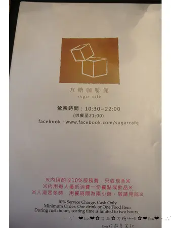 今天是來方糖咖啡館幫朋友慶生我對於這次的評價就只有一個字"差"原本是電話訂位三點整.不過我們提前到那時靠窗的座位還有4人座.不過服務員說已經有人訂了就這麼剛好客人指定坐靠窗?我們就摸摸鼻子坐在他們安排的位置詢問了一位女服務員關於facebook分享的相關優惠他說優惠只有週一到週五才有.不過我覺得他給我的態度很差臉很臭又很不屑還沒開始吃心情就被搞得有點差!!!用餐中途...靠牆角那桌吃完離開. 同行友人告知服務員希望換到那一桌服務員說要幫我們詢問一下...結果還是讓後面來的客人去那一桌整個感覺又更差了!!!!!!!! 就認了 認了 香蕉巧克力煎鍋蛋糕我只能說送餐速度非常之快沒點完多久就送上來了.值得讚許!!視覺上看起來頗厲害....就是為了它而來的~可是就我吃過這麼多家咖啡店的鬆餅來說這家吃起來普通...沒太讓我驚豔鬆餅溫度似乎有點不夠燙...有點小失望厚切火腿滿福班尼迪克蛋今天就只有這道菜沒讓我失望!!!!!整體搭配的口感還不錯!!!番茄起司布雪塔早午餐似乎是有機蛋來著...不過吃起來感覺跟一般的荷包蛋沒什麼差別番茄味道太重整個搭配起來怪怪的...火腿起司歐姆蕾蛋捲不太懂那塊奶油是做什麼的....麵包的溫度好像也不夠讓奶油融化-.-?同行的友人覺得蛋沒什麼味道....直接吃會覺得有點膩如果能加個胡椒粉搭配一點鹽巴或許更好**我們總共有三杯附餐飲料冰美式咖啡和熱美式咖啡還好!其中一杯用茶包泡的冰飲水加太多.味道很淡.喝起來不好喝!連續三道早午餐搭配的都是玉米讓人有些膩.....總之今天有種踩到地雷的感覺!!!!…查看更多