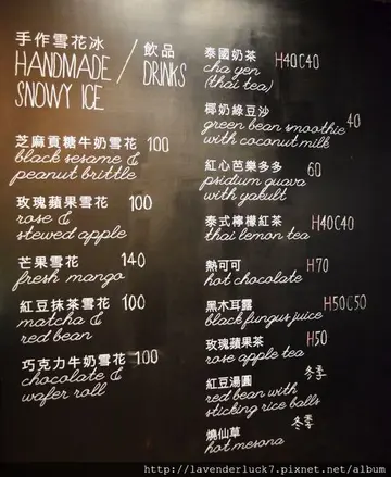 希望能提供您一個白天也可以窩、可以休息片刻、偷閒地方,享受獨特且用料精緻、講究的自製雪花冰、泰國道地奶茶、果汁飲品及甜點。店內環境寬敞的座位及溫馨浪漫的氛圍,讓吃冰也可以很舒適。使用專業的機具,手工調配製作雪花冰磚,設計精緻的擺盤和獨特的口味,隨季節變化甜品,創造出不同的口味和品項,給您視覺和味蕾的饗宴。並從泰國學習道地的點心及飲料,讓您在這裡就能吃得到異國風味。 ---轉自店家網頁介紹 躲在巷子裡的這間店,從外觀怎麼看都不會覺得是冰店呢~! 除了雪花冰,也有販售一些飲料,甚至連果汁都有,而且價格相當實在。 內部怎麼看都像是間咖啡店~ 機器及檯面都維持得非常乾淨 價目表在牆上,單看雪花冰難免覺得有點高,但飲品的價格就相當平實了。 我選了紅豆抹茶雪花,雪花冰本身就是抹茶口味,而且是那種真正的抹茶香氣的!! 仔細看就會發現,雪花冰中真的有不少抹茶粉屑呢! 紅豆不會很甜,有煮軟透,卻還保持粒粒分明未成糊的狀態。 另外這個則是貢糖芝麻雪花冰,據說是店裡的招牌商品。 使用的冰磚是牛奶口味,上頭再灑上碎貢糖和黑芝麻粉,視覺上也真的像極了放大版貢糖。 不過其實我覺得這款的味道不是很重,牛奶味也沒有到很濃,或許是因為甜度也不高吧~? 吃完之後決定再點個飲料喝,店裡一直瀰漫著芭樂味,中間也有人進來外帶芭樂汁,就也點了杯,感覺完全就是在喝芭樂泥~~! 椰奶綠豆沙甜度出乎意料的不高,對有些人來說可能會覺得沒味道,因為綠豆味相當純粹XDD 地址:台北市中山區吉林路26巷21號1樓時間:11:00~20:00(週日公休)查看更多