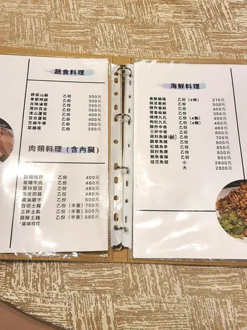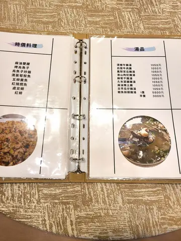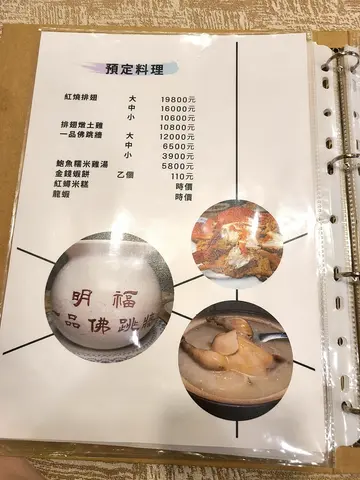 一品佛跳牆 中 / 三杯中卷 / 台菜 / 白切土雞 / 芋泥球 / 炒米粉 / 炸魚鰾 / 紅蟳米糕 / 香酥蝦捲 / 烏魚子炒飯 / 粉肝 / 脆皮肥肠 / 清蒸筍殼魚 / 野菜山蘇 / 蒜泥鮮蚵 / 蒜炒魚腱 / 燒烤九孔 / 鮪魚香腸 / 糯米雞湯 / 蘆筍百合