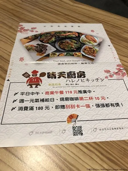 中正紀念堂站的白天很熱鬧、夜晚相對寧靜附近厲害的餐廳都是老字號的名店、想要吃一點家常、全家都可以享受的家庭式日式洋食現在有蠻不錯得選擇、份量大而且價格親切晴天廚房共有兩層樓、一樓以兩人及四人座位為主燈光很溫馨、木質傢俱搭配軟沙發座椅相當舒適 隱藏版的二樓像是日式小閣樓、座位更多、而且是小家庭都可以容納靠近窗戶的座位區、可以容納八個人、中午的採光特別好二樓可以包場開同學會、同事用餐、家庭聚會都推薦點餐請先到櫃台結帳、現點現做、出餐速度並不會很慢日式洋食少不了的酥炸可樂餅(一份為兩片)南瓜風味的可樂餅吃得到新鮮的南瓜丁、綿密而不油膩單純感受天然風味酥脆像是點心、小朋友都會喜歡炸廣島牡蠣(每一份為3顆)麵包粉的外皮好香酥、裡頭的牡蠣很新鮮肥美度因季節而異沾上日式炸物用醬料風味提升日式洋食必吃的當然還有咖哩以芋頭融入咖哩中、上桌的鐵盤上咖哩融合著芋頭的風為三尾肥美的炸蝦天婦羅(使用天使紅蝦)每一隻都很平均碩大晴天廚房的咖哩套餐可以調整辣度套餐附贈泡菜(台式、韓式、黃金泡菜三選一)簡單的日式家庭料理、在晴天廚房都品嚐得到重點是價格很親切天婦羅炸蝦裡頭還有酥炸金針菇花、香菇、糯米椒、還有野菜咖哩醬沾著白飯、厭食的小孩都會大口扒飯日式料理中少不了的烤魚、晴天廚房推出的厚片烤鮭魚定食這份鮭魚碩大到單吃就可以飽足鮭魚肉烤到魚皮很酥、魚肉夾起感受到扎實上頭灑上海苔粉與蝦卵、每一口都是海味魚骨頭很少、小孩子怕魚刺都可以從鮭魚開始babe的最愛還是鰻魚飯因為鰻魚飯的日式便當盒打開有一種真的到日本的感覺鰻魚的誠意在打開便當盒就會發出“哇”的聲音滿滿的照燒風味鰻魚搭配辣味泡菜(韓式)超級厚實的鰻魚、用兩隻筷子插起~超過癮的鹹甜的鰻魚、搭配醬汁、底下熱呼呼的米飯一口吃下超級過癮~價格真的很親切溫玉子梅花豬肉丼套餐上頭那顆玉子蛋躺在滿滿的豬五花肉上頭豬五花沒有過度的醬油風味、吃得出豬肉的新鮮梅花豬肉的油花不會太多、搭配上韓式辣味泡菜(加價泡菜)這溫玉子的熟度雖然稍微多了一些但是這樣的蛋黃風味會是最佳的品嚐口感將米飯、豬梅花、泡菜、溫玉子一起均勻攪拌蠻讓人擔心飯吃太多XDDD男生都會吃飽的等級大口吃肉不傷荷包~來到晴天廚房就對了招牌脆皮雞腿排比臉還要大、厚度也超有誠意脆皮真的很過癮、爽脆的聲音讓人欲罷不能不想吃飯的朋友單點一份招牌脆皮雞排就可以了變化味蕾的淋上台式蒜味辣醬或是單純擠上一點金桔也很可以最後端上桌的是店內的招牌人氣套餐嫩煎里肌牛排定食、三百左右超級划算使用舒肥料理手法讓肉質軟嫩、筋可以輕鬆咀嚼不用擔心肉質太老搭配上一顆溫泉蛋、還有適量的生菜沙拉原來吃牛排可以不用擔心花大錢熟度適中、絕對沒有血水餐後可以喝一點熱鮮奶系列暖胃拿鐵還有漂亮的拉花、抹茶拿鐵茶香十足、晴天鮮奶茶熱飲都很大杯、誠意十足吃多肉類想要解膩、推薦青梅果醋 中正紀念堂附近、居家溫馨料理、日式洋食提供寬敞的座位空間、價格親切划算二樓有小閣樓的隱密感、可以聚餐或是同學會包場…查看更多