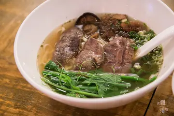 這天來到信義微風店美食街覓食,由於走了一圈沒有特別吸引我們的主食,所以最後選擇了名聲十分響亮的晶華冠軍牛肉麵坊。打著晶華酒店名號、並榮獲第八屆台北牛肉麵節冠軍、更受到了美國CNN推薦,讓人感到相當好奇。晶華冠軍牛肉麵坊,位於信義微風四樓餐廳美食街,擁有摩登現代的外觀,門口更貼著一張大大的冠軍牛肉麵海報。話說信義微風四樓的餐廳選擇還蠻多的,不過消費價格都偏高,較適合有聚餐活動時前來。店內座位還蠻多,用餐環境寬敞,不過正中午用餐時間人潮不多,或許是因為平日的緣故,較少人會前來百貨公司用餐的緣故吧。店內裝潢有些工業風,還貼了不少美式的造型貼紙。餐桌上都有放置的酸菜盒,可以適量加入牛肉麵中調味,個人覺得味道平平,沒有太深刻的表現。點用牛肉麵+100元可以附一份小菜和飲料,選了這盤麻辣百頁,一上桌便嗅到頗濃郁的嗆辣氣息。個人還算喜歡這份小菜,因為辣度夠、麻味也有,雖百頁的口感有些偏乾,但味道上還算不錯,挺開胃的!晶華三冠王牛肉麵 $380元這碗菜單中看似最澎湃的牛肉麵,內含牛腱肉、牛腩條、炸抄手、豆皮、油條、糖心蛋,在食材上頭算是相當豐富的。喝了一口覺得湯頭不錯,溫熱時很順、重口卻不會死鹹,不過麵條部分就沒有我想像中的優秀,覺得不夠有嚼勁。一旁的主角牛肉部分,吃起來不乾柴也不到非常嫩口,算是中規中矩,建議配著湯享用風味更好。而油條、抄手的部分,較喜歡抄手的口感,帶有微脆度的外皮卻不會油膩,沾上湯頭還不錯吃。油條覺得有些偏軟了。另外暗藏在麵條中的豆皮也蠻好吃,算是這碗牛肉麵中的小驚喜,熱熱吃時要小心燙口。冠軍清燉牛肉麵 $320元冠軍清燉牛肉麵則是有些小小失望,覺得湯頭偏油,且清燉的湯頭沒有紅燒來的香,可能我個人偏好重口味的牛肉麵。另外在牛肉的部分,份量還算多也大塊,吃起來還算軟嫩,不過整體豐富度還是三冠王略勝一籌,當然價格也差了不少。或許是因為有著大名號、又有著較高價格的牛肉麵坊,相對的會令我們給予較多的期待,於是當口味並不成正比時就會有些失望。整體來說,其實晶華牛肉麵還是不錯吃的,他並不是不好吃,只是台北好吃又不貴的牛肉麵實在太多、選擇實在太多了!…查看更多