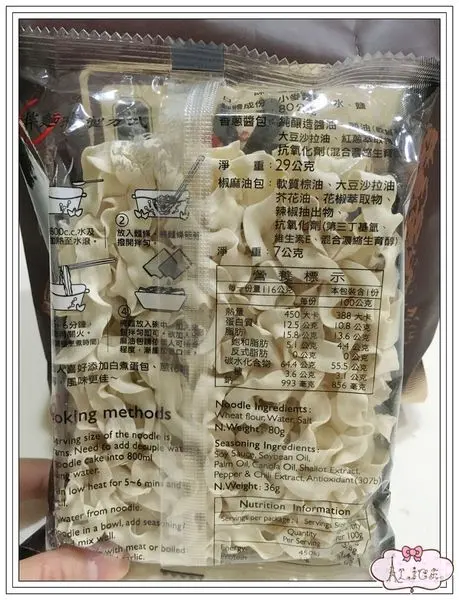 過海製麵所曾拌麵 - 香蔥椒麻藝人曾國城推薦的曾拌麵。。。非油炸,手工製麵~~~ 感覺跟之前介紹的雙人徐很像耶~~~ 目前很多網站都有在販售。1袋4包約NT168元。 每一個麵體都是獨立的包裝~ 所以就算拆開也可以知道有效日期/成份/煮法等等資訊! 我比較喜歡這樣的包裝耶~~~ 這次小表嫂買給我們的是香蔥椒麻口味!!!裡面有麵 / 蔥油拌醬包 / 椒麻油包 麵只要煮個5分鐘就會熟了。但實際可以依照個人喜好煮麵~~~麵看起來很少,但是放入滾水中煮後就覺得好多哦~~~而且捲捲的麵看起來又更可口耶。這麵好像邊邊比較薄透一點~而且也很快熟。 醬汁依個人喜好放入碗中~~~辣油也可以適量!!! 我覺得蠻辣的。。。很夠味。 麵算是蠻大碗的~~~~~ 而且剛煮好的麵拌均後很快就入味了。。。 大家可以依自己喜歡搞創意~~~ 我只是簡單放個蔥花,一顆茶葉蛋!!! 這樣~~~ 因為已經很餓了,所以懶得弄其他東西了。不然平常會加青菜跟水波蛋的~~~…查看更多