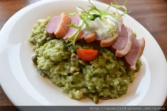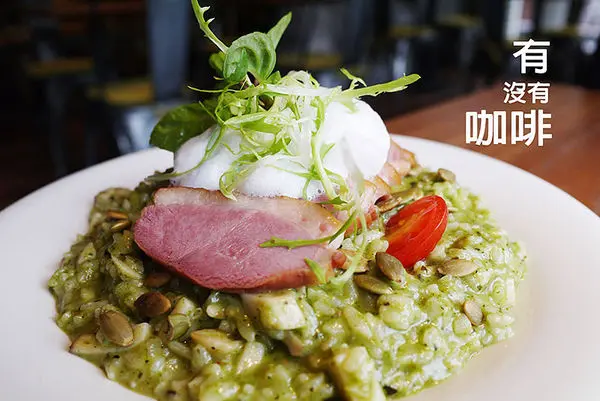 過年期間吃了不少大餐,突然想念起一般口味的義式料理,於是就約了好友來到有一陣子沒來的士林,出來走走透透氣,也順便拜訪這家【有沒有咖啡Double H 壹號店】。【有沒有咖啡Double H 壹號店】從捷運士林站一號出口走出來1分鐘就到了,樓下有知名的一之軒烘培坊。入口佈置的感覺不錯,以人文、設計和咖啡為整體概念門口有大型菜單立牌,比較不會被錯過。二樓入口處有一水幕的設計,在這樣的空間裡,感覺很特別裡面的環境簡潔舒適,座位也蠻多的,如果客滿的情況,應該很熱鬧。看菜單時間,店裡除了義大利麵、燉飯等主餐外,也有三明治、蜜糖吐司、鬆餅等輕食甜點。店家低消規定是一杯飲料,若只點餐無法折抵低消,而且用餐限時90分鐘,若沒客滿是不會趕人。飲料部份都看起來很美,還蠻吸引人的!店裡咖啡是使用全世界最大品牌LAVAZZA的咖啡豆,茶品也是使用HEDIARD的茶葉甜點自然也是店內的招牌品項「青醬鴨胸燉飯」250元,擺盤看起來不錯,上面用奶泡+綠色蔬菜裝飾,粉嫩的鴨胸肉和滿滿的青醬燉飯就在盤裡,聞起來有香氣,看起來也挺吸引人。這盤燉飯裡還灑了不少堅果,增加了燉飯的口感層次,吃起來帶有堅果的香味,我個人還蠻喜歡的。份量是還不少,以二個女生來說胃口不大的話可分食吃飽應沒問題。裡面的鴨胸有六片,肉質吃起來又香又嫩,味道很好,我很喜歡青醬燉飯米芯有透,醬汁也十分濃郁,香味夠鹹度適中,一入口就覺得好吃極了!飯後準備吃甜點,我們點了「法式MOBANA經典可可歐蕾」140元,香濃的可可不甜膩,在冷冷的天氣喝,暖暖手也暖暖身。「玫瑰海鹽拿鐵」160元,裡面玫瑰的味道很濃郁,咖啡味也頗濃,帶點甜味和海鹽的味道,還不錯。附有一片堅果手工餅干「草莓拉傑姆金磚蜜糖吐司」280元,冬天就是要吃草莓啊!當然它吸睛的外表總是很讓女性朋友買單。金磚的頂部有一顆大冰淇淋,淋上鮮奶油,在綴上小紅莓果和巧克力馬卡龍,華麗現身。底部以一塊又一塊切得四四方方的金磚堆砌成塔,再綴上新鮮草莓和藍莓,把平凡的厚片吐司變成可口的甜點。吐司金磚的奶香味很濃郁,外層裹了一層薄薄的糖衣,但吃起來香而不甜膩,而鮮奶油可喜的也不會油膩。上頭的冰淇淋一挖開來才知道是草莓口味,冰淇淋也很香甜可口。雖然這次吃到的東西不多,但我點的這二樣都讓我很滿意,跟大家分享囉!…查看更多