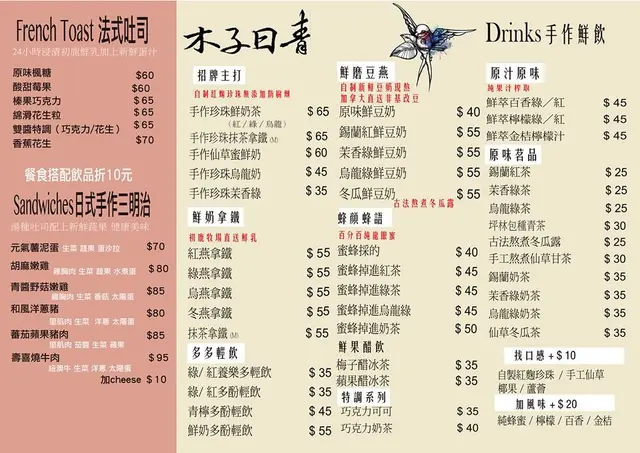 又衝一發來喝美美的漸層飲料溜!!前陣子南韓女團APINK來台記者會上喝的飲料omo看到影片上團員真情流露就知道很好喝而她們喝的珍珠飲料就是出自木子日青之手啦~~木子日青 日嚐專賣店地址:台北市大安區四維路170巷25號電話:02-27063201營業時間:10:00~19:30(周日公休)無座位。近捷運科技大樓站步行約5~8分鐘店內沒有座位以外帶為主來看看【Menu】↓主要販售飲料另外也有三明治和法式吐司另外隱藏版草莓牛奶是超夯隱藏版飲品!!!(來了別錯過了~)【手作珍珠抹茶拿鐵(M)】65元+10元換紅麴珍珠美美的抹茶漸層再加上紅麴珍珠看起就十分有聖誕節氣氛的飲品抹茶帶有點微苦的韻味奶香比較明顯喝起來有點沙沙粉粉的感覺粉粉的珍珠沒有特別的味道吃起來是甜香QQ的十分有嚼勁不會膩口很好吃~【手作珍珠鮮奶茶(L)】65元這杯omo愛~茶香和奶香都很突出的飲料無糖不會有茶的澀味加上有嚼勁好吃的珍珠大杯喝起來很有飽足感(嗝珍珠真的很好吃~推~【胡麻嫩雞三明治】80元雖然主要是以飲品為主但是三明治意外表現得不錯內容有生菜、雞肉、水煮蛋和蘋果再淋上胡麻醬看起來很清爽很有份量很飽胡麻醬的味道很濃郁帶有點日式風味和胡麻的香氣雞肉分量不多但是口感自然好吃搭配蘋果和生菜清爽~很適合當早餐【結論】:老闆娘態度很親切~珍珠真好吃!!可以為了它再衝xD!!飲料omo偏愛鮮奶茶~好喝茶香奶香都很明顯味道濃郁無糖也不錯輕食的三明治有份量吃起來感覺康清爽的胡麻香氣十足有紙袋包著不會髒手一杯無糖茶加上三明治當早餐感覺健康!!下次再來試試看隱藏版草莓牛奶!!推薦給大大參考謝謝大大的閱讀~~~…查看更多