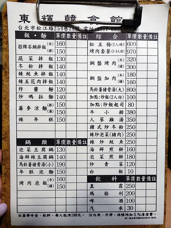 某日和朋友去行天宮拜拜, 時間接近中午, 朋友突然想起附近有 [東輝韓食館], 聽說這間的馬鈴薯排骨湯很道地,不少人推薦, 她一直想試試, 總算有機會來到這一帶,我們就移動過去。後來發現就在錦州街旁的巷子裡, 是我們以前待 P 社時的活動範圍啊! 以 [東輝韓食館] 的外觀感覺是蠻有年紀了, 但我們又一直想不起來以前有這間店嗎? 隱約記得那條巷子是有間韓國料理, 但那時我們還沒那麼愛吃韓食,也許就吃過一兩次吧? 會不會就是那間搬過來的呢? (也約莫八、九年前的事了吧不要太強求我們的記憶了,哈哈哈哈)不過沒想到 [東輝韓食館] 比我們預期的還要熱門, 大概 11:30 它剛開店, 我們打電話過去問,就已經沒位子了, 應該是全數都開放訂位了... 後來走到店裡看,他們的座位其實也不多,加上附近很多上班族, 難怪一下就滿了。 好在他們有限制用餐時間 90 分鐘, 大家都能等,我們也就先登記、留了電話,先到附近走走。 後來其實窩在 7-11 裡聊天了,哈哈哈哈, 等了一個多小時才入座。//////[東輝韓食館] 就是那種早期開的, 不是什麼華麗的餐廳, 比較簡陋,會賣很多種韓食的小館子。 聽說老闆是韓國華僑, 發現台灣比較少見馬鈴薯排骨湯,才會特別引進。在韓國馬鈴薯排骨湯可以是有不少專賣店的呢, 2016 年我們就曾一起到新村去吃 [真利味馬鈴薯排骨湯 참이맛감자탕], 這也是間連鎖品牌, 當時大家都還蠻喜歡的。 確實那之後我也就沒再吃過馬鈴薯排骨湯了呀!菜單就簡單一張,品項還蠻豐富的, 除了馬鈴薯排骨湯, 還有麵飯、鍋類、烤肉、各式韓式小炒及煎餅... 人少人多都可以來吃。 很多菜都蠻想吃的, 不過因為我其實也吃了早餐不久, 所以就很含蓄的點了馬鈴薯豬骨湯,再加一些小食(結果都不小! 比較妙的是,雖然是中午, 但發現蠻多人... 應該是說一半以上的桌數都點了銅盤烤肉! 搞得我們也差點想點下去!這裡不收服務清潔費, 不過每人低消是一道菜喔。//////小菜 一開始店家送上了四盤小菜給我們, 是店家招待的。 有兩種:辣蘿蔔和黃豆芽, 看其他人的食記好像是吃完可以續的。 兩個味道吃起來差不多,微辣爽脆,但蘿蔔吃起來有點兒酸。另外店裡也有麥茶和海帶湯,可以自行取用; 需要餐具或多的碗也都自己來喔~馬鈴薯豬骨湯 (大) $850 看到這馬鈴薯豬骨湯,我們都有點驚呼! 也疊太高了吧!? 光這個態式我們就說:「有有有、有還原!」 事實上比照了一下之前的照片, [東輝] 給的更大一鍋, 裡面有五支帶肉的豬骨,剛好夠我們分,我也感覺更大一支。豬骨湯上疊了大量的山茼蒿、金針菇、泡菜、辣醬和一些辛香料, 湯裡則有一些年糕和馬鈴薯塊。 店員會來協助處理, 將所有的料慢慢壓入湯汁裡, 然後叫我們先用豬骨,是事先已經燉好的。 蔬菜可以煮爛一點再吃~ 而湯若變少了,店家也會來幫忙加高湯。 豬骨我還蠻喜歡的, 燉得已十分軟爛,稍微撥一下就能肉骨分離。 而湯頭,我是覺得也不錯, 微微辛辣、濃郁肉湯又有蔬菜的香甜,相當暖胃。 但這裡沒用芝麻葉,這個影響整體風味蠻關鍵的食材, 可能台灣也不好買吧, 就會覺得不夠正統,還原程度 90%! 但它本身還是好喝的湯啦~年糕是寧波年糕,煮得軟軟QQ, 也吃得到一塊塊的馬鈴薯,吸足了肉汁,吃起來特別有味, 這點有加分。 如果是一兩個人來,或只是想嚐味道, 也是有小鍋的可以點喔。 海鮮煎餅 $190 走豪邁路線的海鮮煎餅,又大又厚! 是那種粉漿比較少的,一口咬下可以吃到滿滿的料~ 估計是有點半煎炸的處理, 煎餅的外皮相當酥脆,口感很好,但吃到後面會有點油膩。 還好沾了特製沾醬有稍微蓋掉一些。 辣炒魷魚 $300 這整個紅成一團,看不出誰是誰的辣炒魷魚, 我們都蠻喜歡的, 用了大量洋蔥、蔥段和魷魚拌炒, 甜辣甜辣的紅色醬汁,整個超級下飯欸! 忍不住一口接一口的~炒碼拉麵 $170 韓國人最愛的兩種麵食大概就是炸醬麵和炒碼麵, 它們都是由韓國華僑發揚光大的韓式中菜。 我個人是只有吃過炸醬麵, 也蠻愛黑色炸醬鹹甜濃稠的風味; 炒碼麵因為本身會辣, 我就不太會主動想吃。 (之前只有試過炒碼風味的泡麵,結果超難吃!)炒碼麵用韓式辣椒醬拌炒海鮮和蔬菜, 再加入高湯煮沸後,澆在麵條上... 整碗會看起來鮮香紅辣。而原本以為這炒碼拉麵大概就是一人份吧? 結果上桌超大一碗! 上面料不少,底下則滿滿是拉麵。 我們也是有點傻眼~ 吃了前面那些東西已經有點飽了。我吃了一點,拉麵真的是很 Q 彈,還蠻好吃的, 湯頭也不算很辣,我是還能接受(但也確定我沒有在迷炒碼麵,哈哈哈 但吃過韓國道地炒碼麵的朋友, 表示它有點太淡了,應該要再鹹再辣一點, 但或許店家調整成了比較適合台灣人的口味也不一定。//////我們好像沒有點很多,但又吃得好飽! 再加上早起,後來大家都差點進入彌留狀態 XD 而以為結帳會不少錢, 結果一個人才 $250, 怎麼好像有點便宜?! 朋友說這才是吃韓式料理的正常價位啊! 後來很多韓式餐廳,有一點裝潢就不知在貴什麼, 然後還不好吃,那真會氣死人~這餐吃下來也才知道 [東輝韓食館] 為何能一開店就客滿, 這裡的韓式料理真的是蠻厲害的, 愛韓食的朋友們有機會也來嚐嚐吧!…查看更多