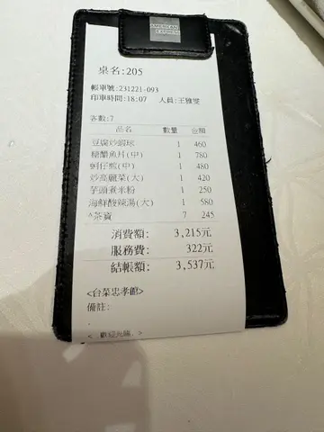 在聖誕節前夕,到台灣旅遊。這是疫情後首次與家人一行七人到台北遊覧,心裏充滿着期待。第一天到步已經下午;只在酒店附近走走。家人提議第二天晚上去吃地道台菜,所以麻煩了包車的美女車手;幫忙代訂「欣葉台菜」。不知道是否臨近冬至;枱一早就滿座,只可以5時到座,6:20 分要交枱。第二天的行程是宜蘭一天遊;由宜蘭回程到台北的行程上比較塞車,到達餐廳已經是5時30分左右了。我們被帶到餐廳較後的大圓枱,開放式廳房好有privacy,七人座非常闊落。由於之前在宜蘭的午餐也未得來消化;所以指點了一些小炒。我們點了蚵仔煎,豆腐灼蝦球,糖醋魚片,芋頭煮米粉等;其中的蚵仔煎我覺得最好味,蚵仔比想像中多同非常新鮮,每一口都吃到蚵仔,超正👍🏻。另,這𥚃的服務很好,工作人員非常有禮。吃完所有點的菜,餐廳送上細細粒的糯米糍,為這一餐劃上完美的句號😄總括而言,今次真係時間不夠;下次真的要多預留時間,可多試其他菜式。還有一點要注意,一定(x 3次)要先訂枱,否則會撲空呀!😅…查看更多