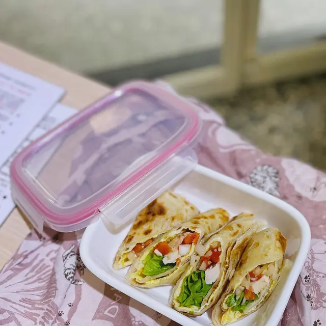 日式燒肉 雞肉親子飯糰 / 台式羅勒三杯雞蛋餅 100 元 / 柚香胡麻豬蛋餅 / 烤飯糰 / 脆皮鹽可頌 / 提拉米蘇蛋餅 / 抹茶一加一 / 鮮奶茶 / 台式羅勒三杯雞蛋餅 / 日式味噌豬肉蛋餅 / 墨佬辣肉醬雙起司蛋餅 / 味噌辣鮭魚本丸 / 炙燒粉紅明太子本丸 / 抹茶1+1